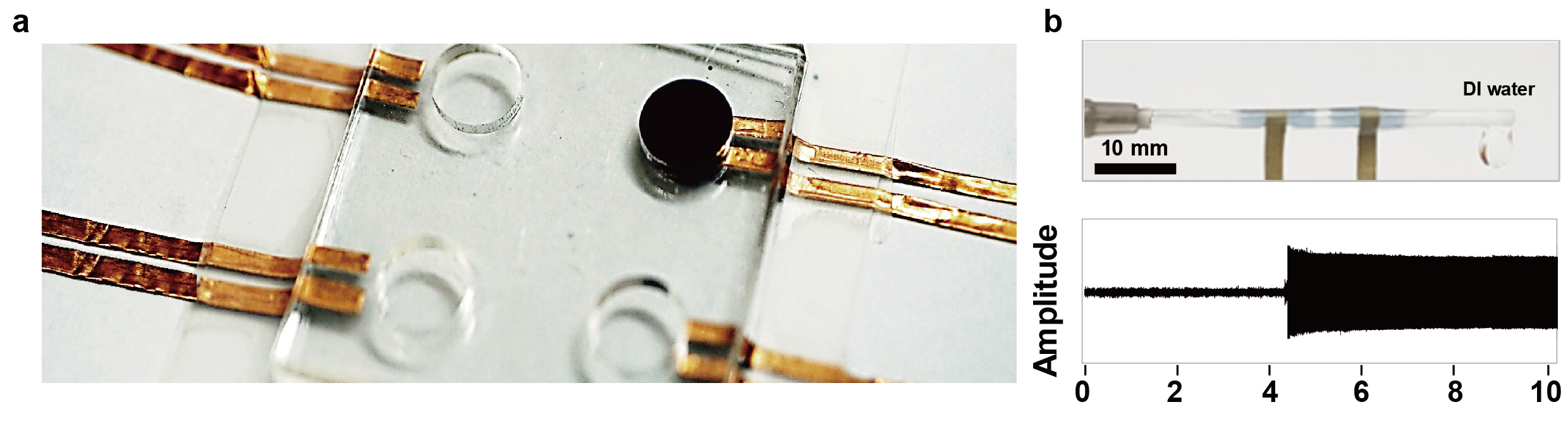 Figure 2. (a) A photograph of the position detection LIFS AC pad with conductive PEDOT:PSS solution in water. (b) A photograph of the rolled tube-type LIFS AC device. Sound amplitude monitored with time when deionised water was passed through the tube.
