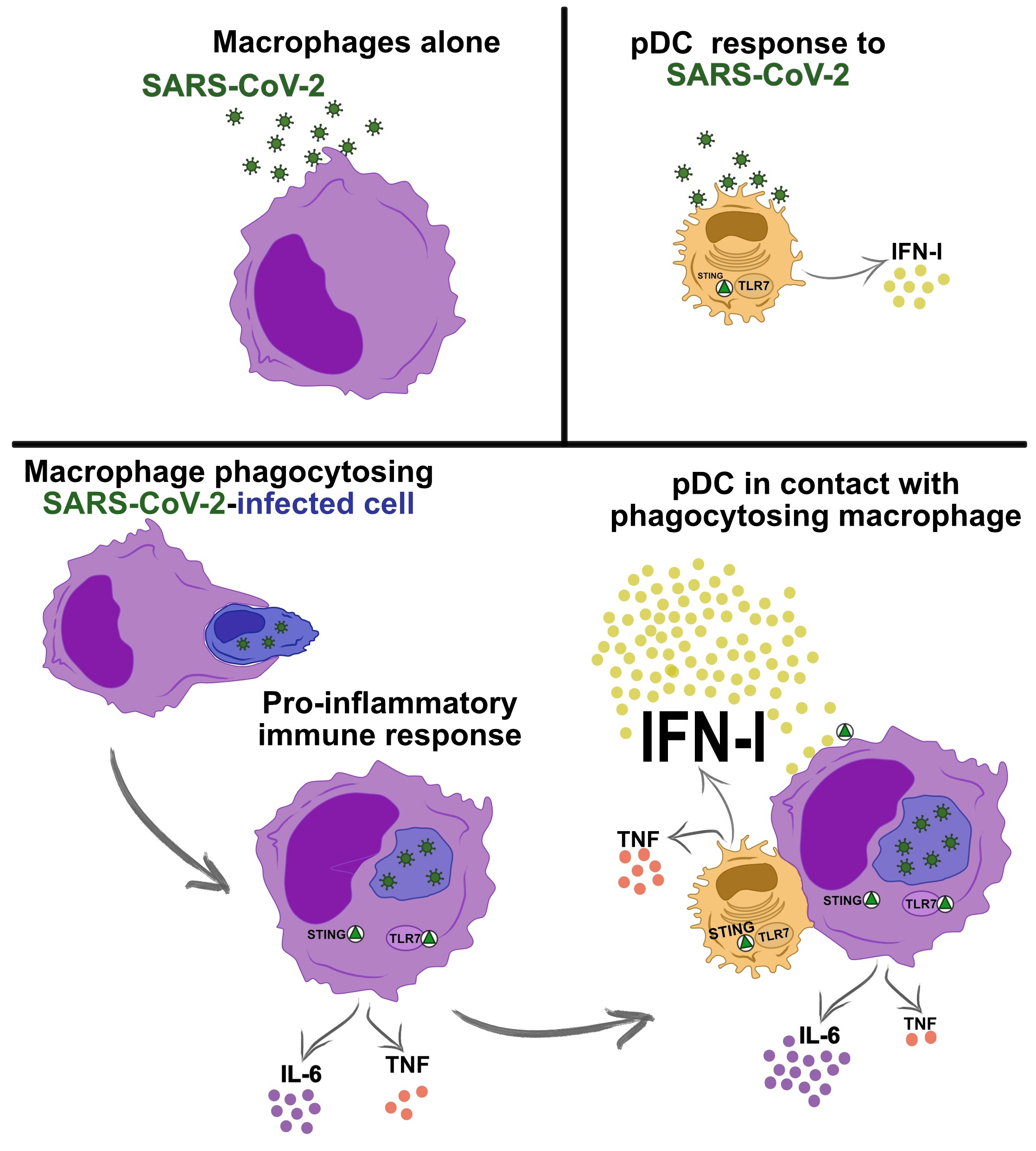 Based on this knowledge, we were wondering if pDC could go beyond sensing of infected cells and even react to macrophages that had phagocytosed infected cells. Indeed, after adding pDC to macrophages that had phagocytosed SARS-CoV-2-infected cells we detected very high levels of IFN-α in the cell culture supernatant. Strikingly, these IFN-α levels were up to ten times higher than pDC responses after stimulation with viral particles or with virus-infected Vero E6 cells. This is fascinating in light of the known protective effects of early strong IFN-α during COVID-19. On the other hand, such responses may also be involved in COVID-19 pathogenesis, considering that the levels of IL-6 and TNF were also higher when pDC were added to the culture system.