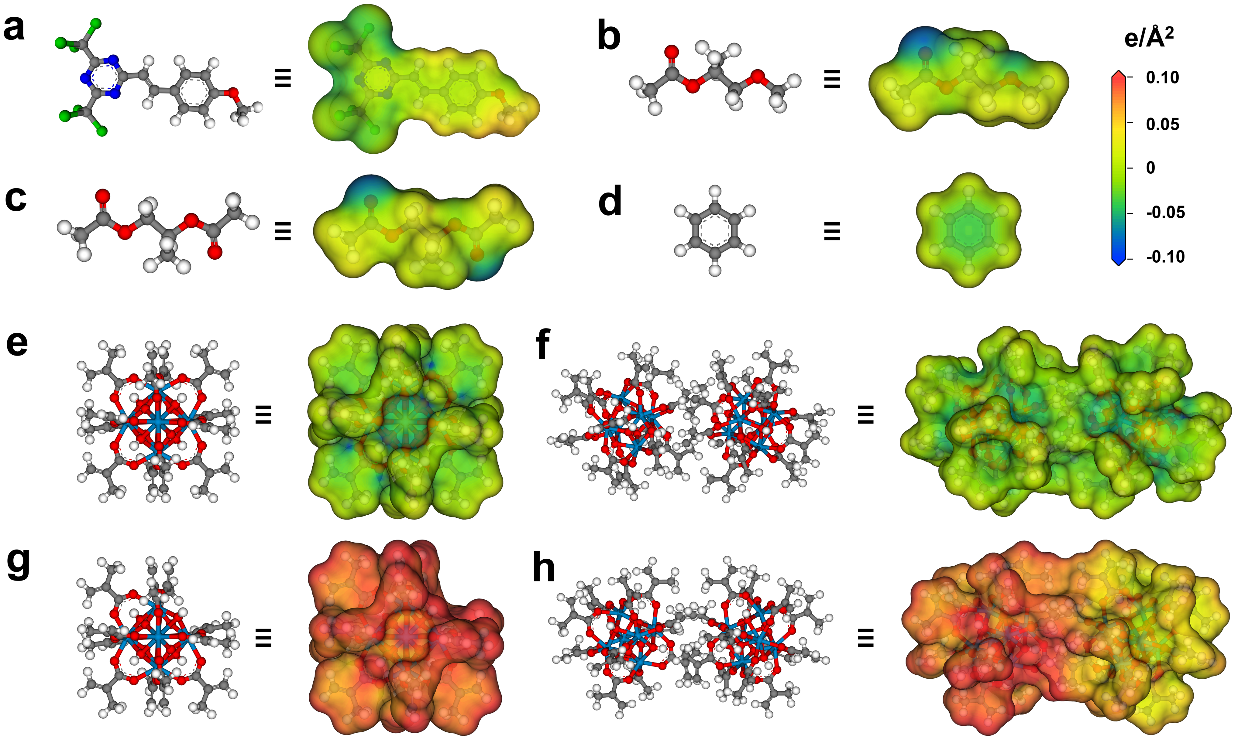 Figure 2 | DFT-COSMO simulated structures and charge distributions. a, Initiator BTMST. b, Photoresist solvent PGMEA. c, Developing solvent 1,2-propanediol diacetate. d, Benzene. e, ZrO2 hybrid. f, ZrO2 hybrid-ZrO2 hybrid aggregation (before exposure). g, ZrO2 hybrid cation. h, ZrO2 hybrid cation-ZrO2 hybrid aggregation (after exposure).