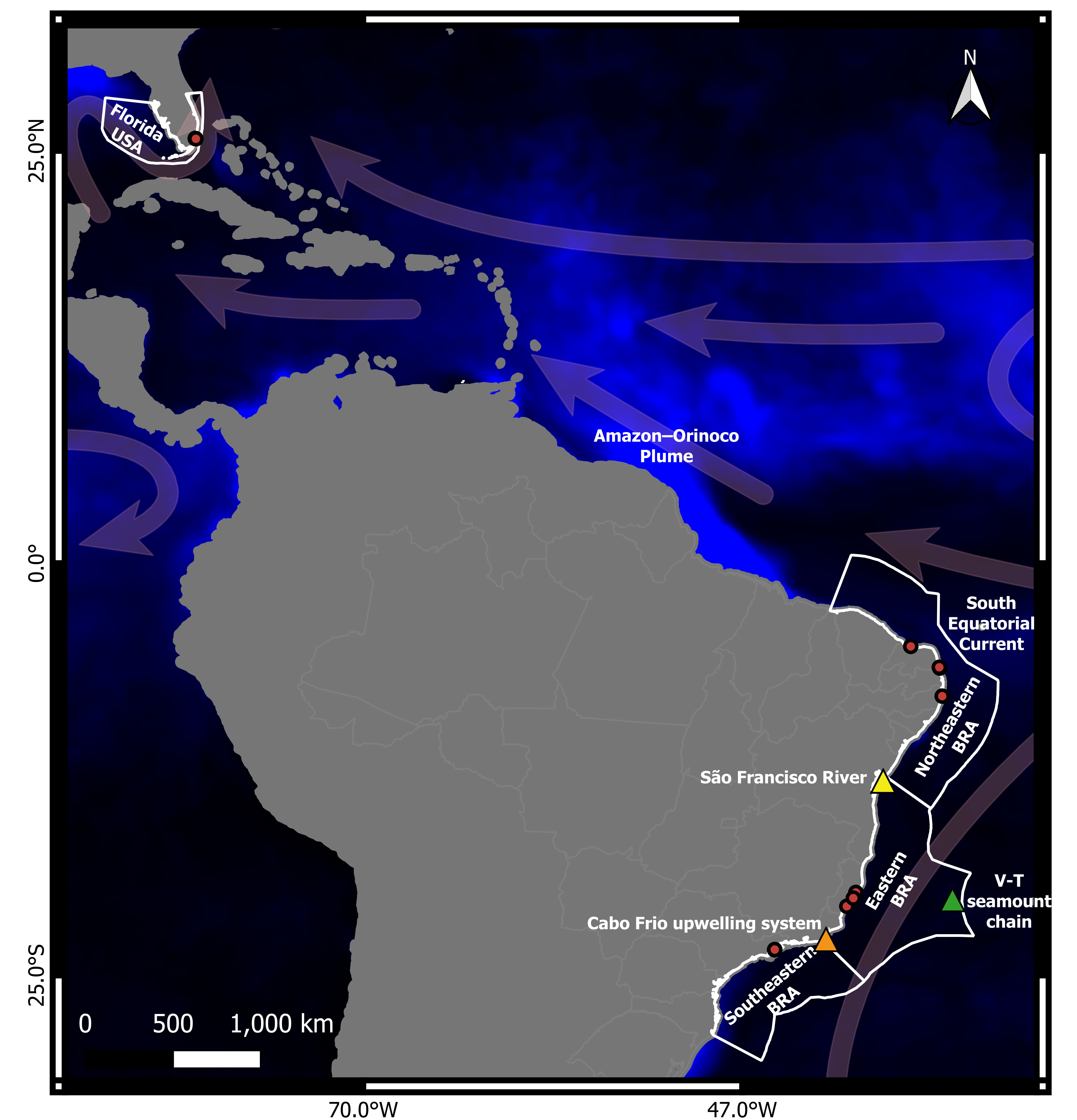 In the lab, the work shifted from sea to sequence. Building ddRAD-seq libraries required precision and patience, but the resulting data revealed clear genetic differentiation between northern and southern populations. This pattern aligned with the Amazon–Orinoco Plume (AOP), a vast freshwater discharge that, while not a strict barrier, creates salinity gradients capable of shaping larval dispersal and limiting connectivity.