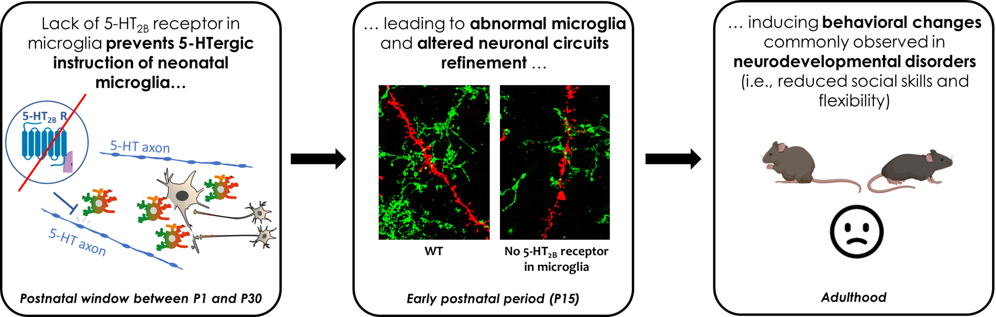 Serotonin (5-HT) plays a key role during neurodevelopment. In mice, increasing or decreasing 5-HT availability during development alters emotional and sensory neuronal circuits maturation, and has long-term effects on anxiety and sociability in adulthood. Accordingly, hyperserotonemia is observed in 25% of patients with ASD and was one of the first biomarkers identified for ASD. Nevertheless, the mechanisms underlying the implication of 5-HT in the etiology of neurodevelopmental disorders remain partly elusive due to the potential action of 5-HT on different cell types. In our study, recently published in Molecular Psychiatry, we tested the hypothesis that impaired 5-HT sensing specifically in microglia during a postnatal window between birth and P30 is sufficient to alter the refinement of postnatal circuits, thereby inducing abnormal behaviors relevant to ASD. To this aim, we used a conditional knock-out murine model in which the Htr2b gene (which encodes for 5-HT2B receptor, the main 5-HT sensor in microglia) was deleted only in microglia since birth or during adulthood.