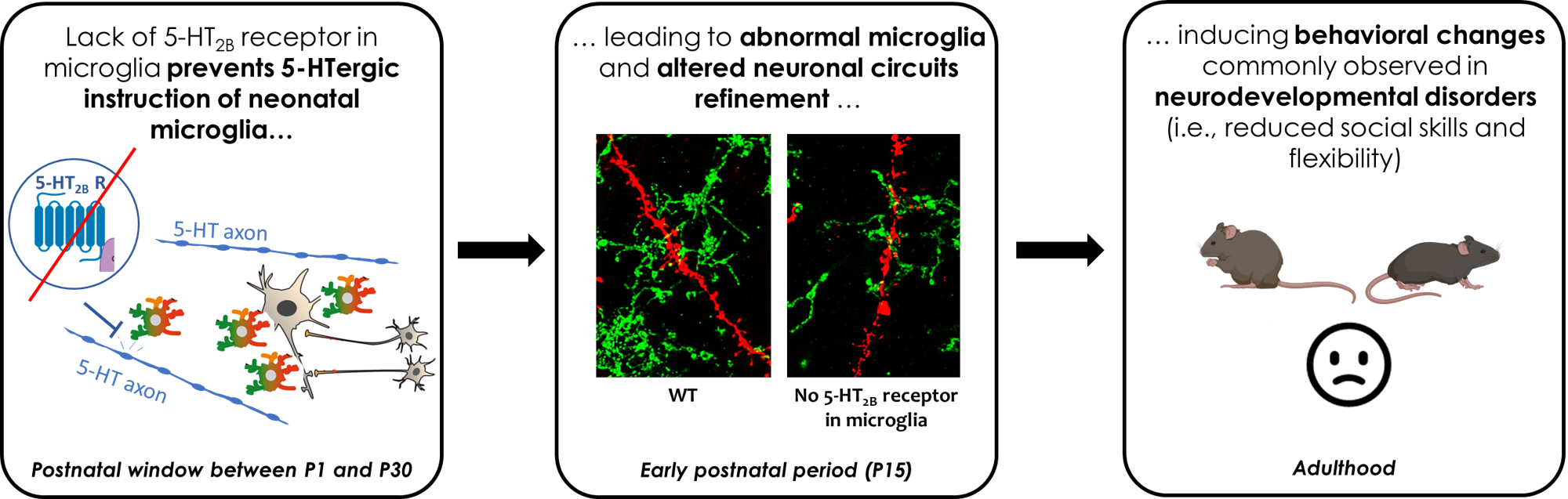 Serotonin (5-HT) plays a key role during neurodevelopment. In mice, increasing or decreasing 5-HT availability during development alters emotional and sensory neuronal circuits maturation, and has long-term effects on anxiety and sociability in adulthood. Accordingly, hyperserotonemia is observed in 25% of patients with ASD and was one of the first biomarkers identified for ASD. Nevertheless, the mechanisms underlying the implication of 5-HT in the etiology of neurodevelopmental disorders remain partly elusive due to the potential action of 5-HT on different cell types. In our study, recently published in Molecular Psychiatry, we tested the hypothesis that impaired 5-HT sensing specifically in microglia during a postnatal window between birth and P30 is sufficient to alter the refinement of postnatal circuits, thereby inducing abnormal behaviors relevant to ASD. To this aim, we used a conditional knock-out murine model in which the Htr2b gene (which encodes for 5-HT2B receptor, the main 5-HT sensor in microglia) was deleted only in microglia since birth or during adulthood.