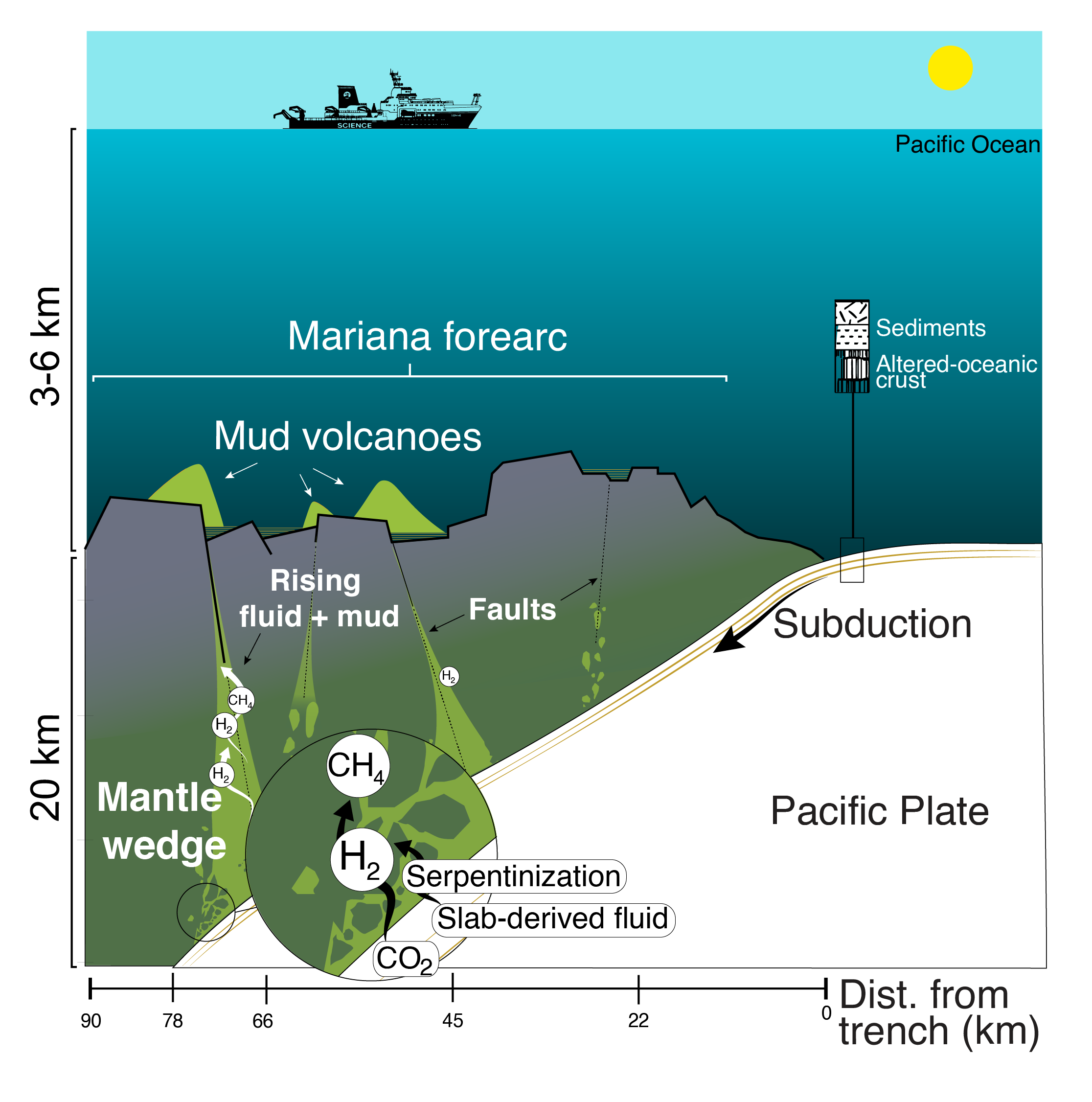 At the heart of this system is serpentinization, a slow reaction between ultramafic rocks and seawater. The Mariana forearc is a geological perfect storm. Fluids released from the subducting Pacific plate react with mantle rocks, producing molecular hydrogen. Dr. William Brazelton described H2 as “the closest thing to a free lunch the universe provides”, highlighting its role as a prime energy source for life in extreme environments. Carbon dioxide (CO2) from the subducting plate can combine with H₂ to form methane (CH4). These reactions create natural chemical gradients that sustain life without sunlight through chemosynthesis.