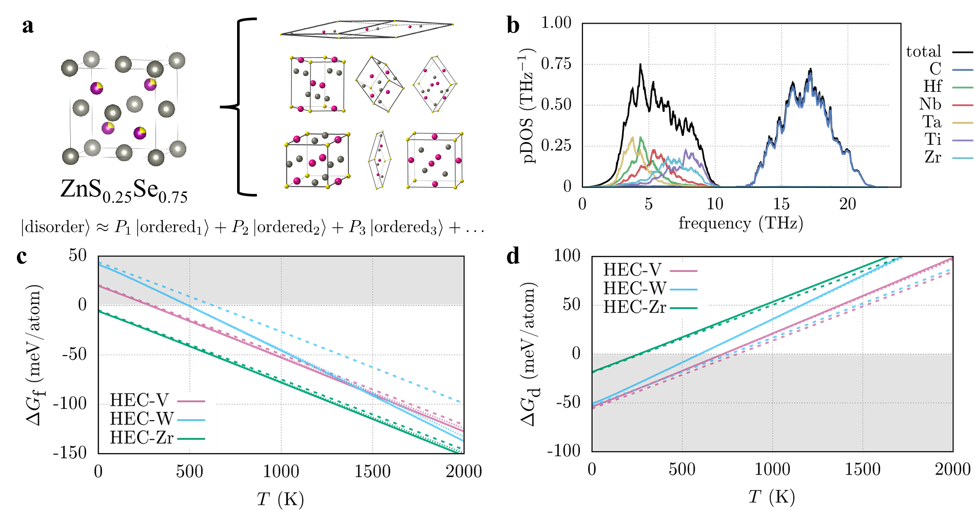 Figure 1 a Schematic representation of the Partial OCCupation (POCC) method using ZnS0.25Se0.75 as an example. The disordered material (left) is described using an ensemble of ordered representatives (right) using thermodynamic weights P. b Phonon density of states (pDOS) of (HfNbTaTiZr)C5 (HEC-Zr). c and d Gibbs free energy for the formation (DGf) and decomposition reactions (DGd) of the high-entropy carbides with (solid) and without (dashed) vibrational contributions.