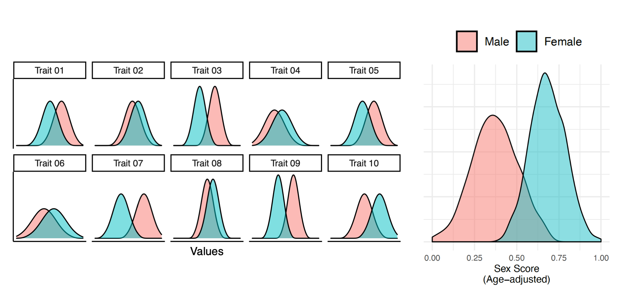 While – on average – there are many sex differences across traits, such as height, the distributions of males and females for these traits overlap considerably. Besides the reproductive organs, sexually dimorphic traits vary along a continuum. Dr. Paus and I thus developed an approach in our Nature Human Behaviour paper to investigate inter-individual effects of sex, generating a "sex score" that varies in a gradual manner from extreme "maleness" to extreme "femaleness." We did this for each individual by summing up their values on 48 quantitative traits across the brain and body, with greater scores indicating greater "femaleness." For each individual, we weighted these scores by the known (average) sex difference for a given trait. This may be thought of as a "polyphenotypic" score, aggregating sex effects across multiple phenotypes, analogous to a "polygenic" score which aggregates genetic effects across multiple genetic variants.