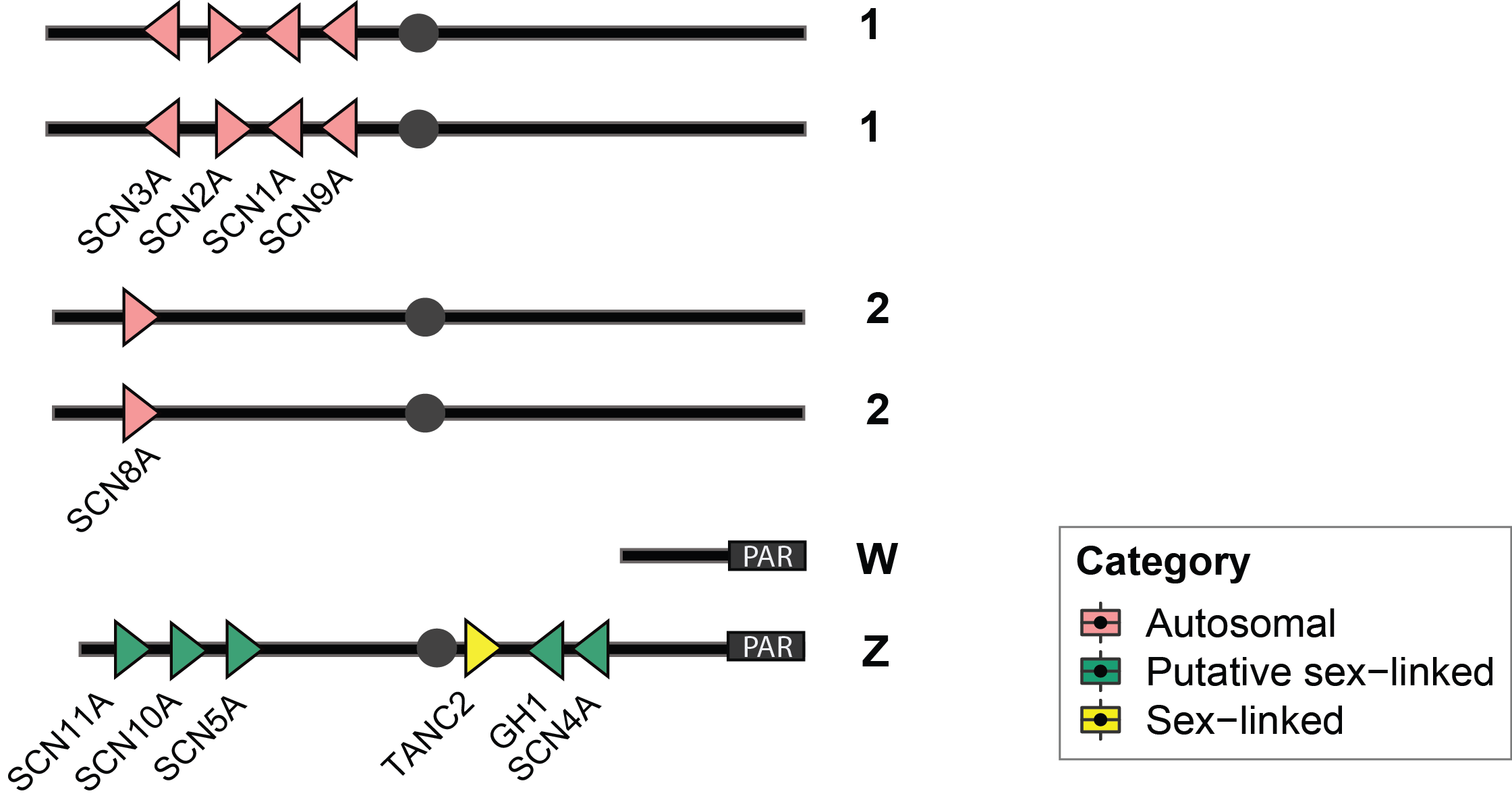 Fig 1. Chromosomal locations of voltage-gated sodium channel (SCN) genes in female snakes (PAR= recombining Partially Autosomal Region).