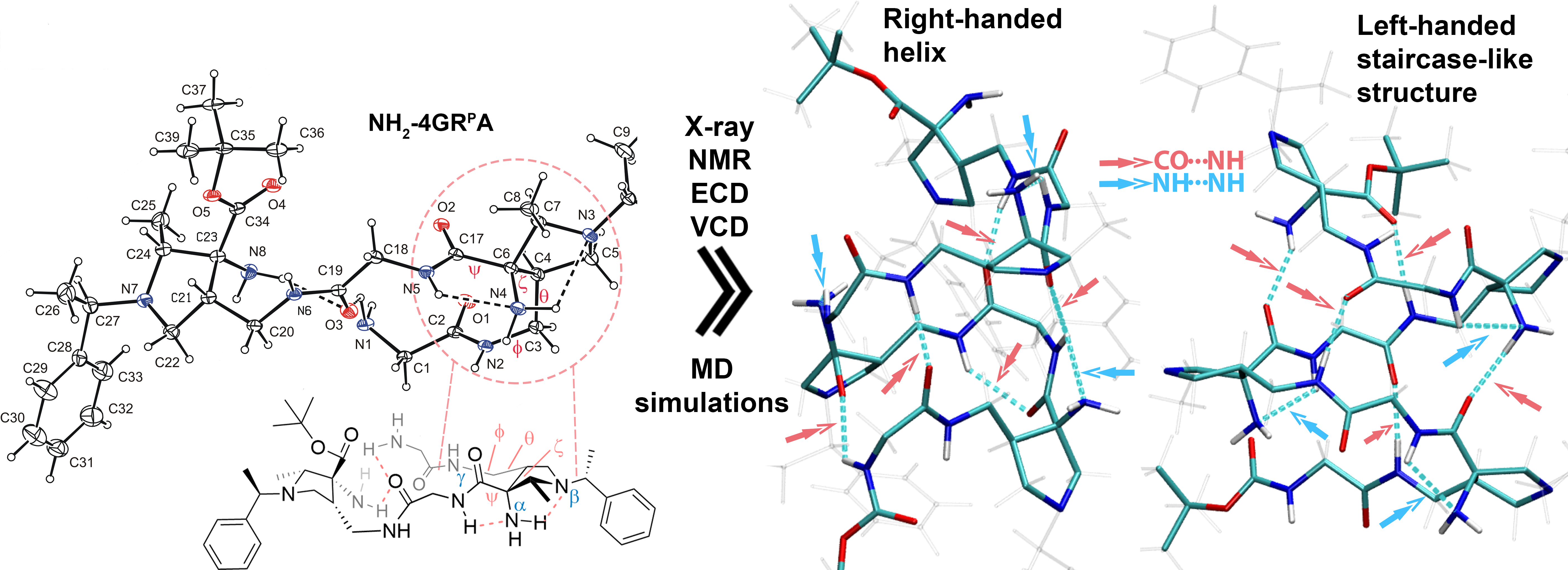 We aimed to investigate the identity of secondary structure. The first piece of the puzzle was obtained by the X-ray crystal structure of tetrapeptide NH2-4GRPA, which revealed an NH···NH2···NR3 hydrogen bond network (Figure 3). This network bridges the AAMP unit via two five-membered rings, locking its backbone geometry in an unprecedented triazaspiranoid-like arrangement. Next, we conducted NMR studies, including titrations and ROESY experiments, which confirmed the presence of these hydrogen bond networks in all higher oligomers in solution. We also identified long-range NOE interactions, providing an initial idea of the overall structural shape. To obtain a complete structural picture, we combined the NMR experimental results with molecular dynamics simulations and quantum chemical calculations. Molecular dynamics simulations indicated preferential occupation of two secondary structures: an 18/20 right-handed helix and a left-handed staircase-like structure. Finally, we leveraged chiroptical methods, including ECD and VCD, which confirmed the right-handed helical arrangement and also showcased its presence in the aqueous environment.