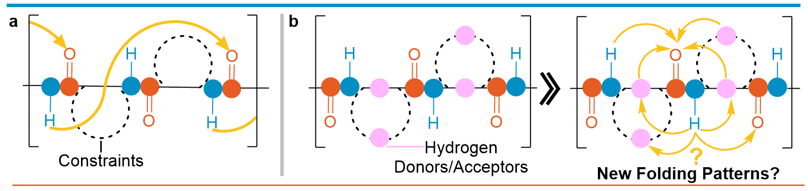 Considering the introduction of extra hydrophilic functional substituents, the backbone may gain new interactions and organize itself to unique folding patterns potentially making them compatible with aqueous environments. Conversely, nature demonstrates that the significant presence of charged and hydrophilic amino acids capable of forming hydrogen bond networks may increase their mobility resulting in rapidly interconverting conformations, as seen in intrinsically disordered proteins. Guided by these facts, we hypothesize that non-natural amino acids, which provide additional free amino groups, both at the periphery and along the backbone may significantly affect the folding patterns and result in unique secondary structure motifs (Figure 1b).