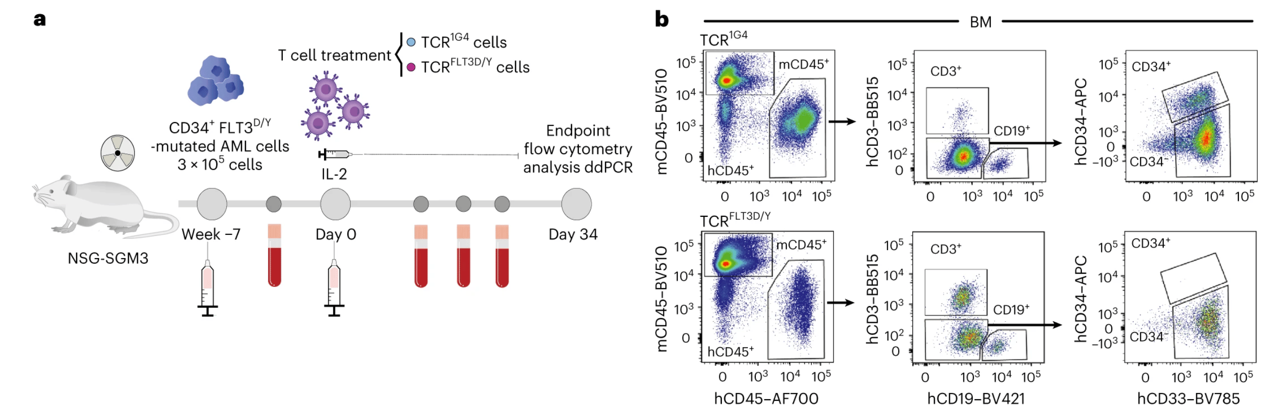 Figure 2. FLT3-D835Y TCR T cells eliminate primary AML cells in vivo. (a) Experimental set up. (b) Flow cytometric profiles of bone marrow (BM) from mice treated with control TCR T cells (top) and FLT3-D835Y TCR T cells (bottom) 34 days after treatment showed complete elimination of the CD34+ AML compartment by the FLT3-D835Y TCR T cells while non-mutated CD19+ B cells were spared.