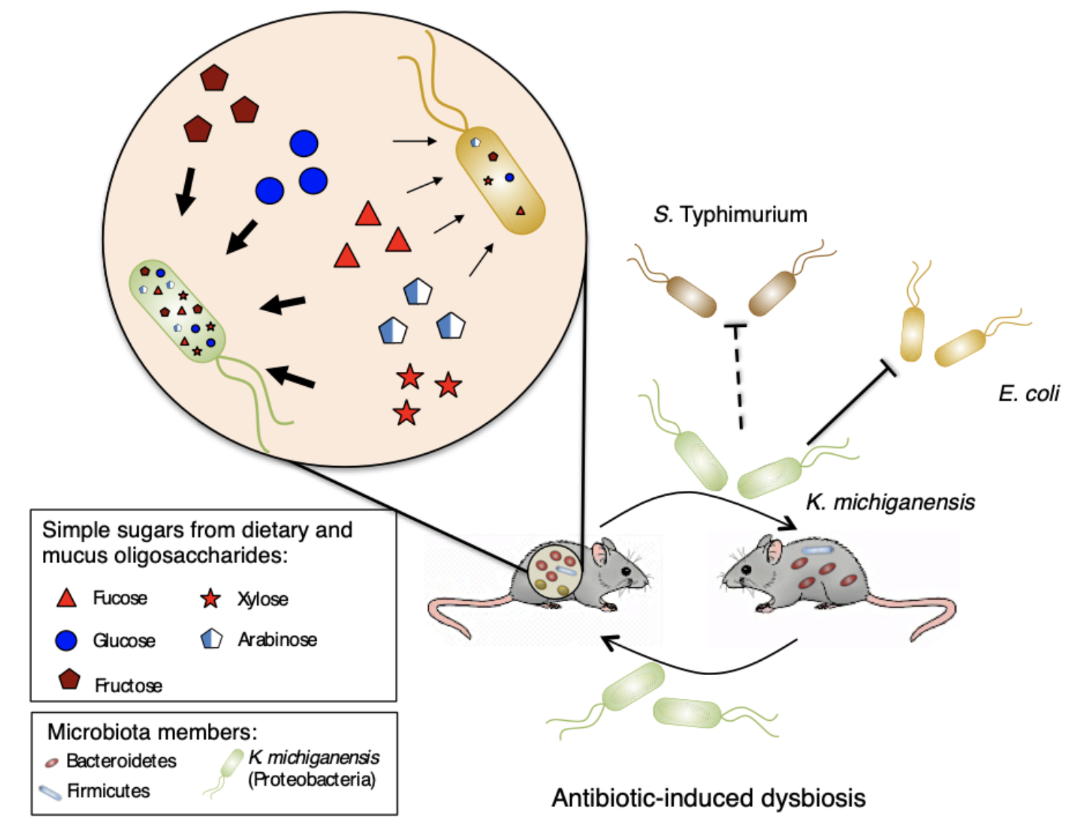 In our latest work, now published in Nature Microbiology, we studied the effect of sharing microbiota among hosts in gut recolonization post-antibiotic-induced dysbiosis and identified a keystone microbiota member that is sufficient to restore colonization resistance against Enterobacteriaceae by nutrition competition.