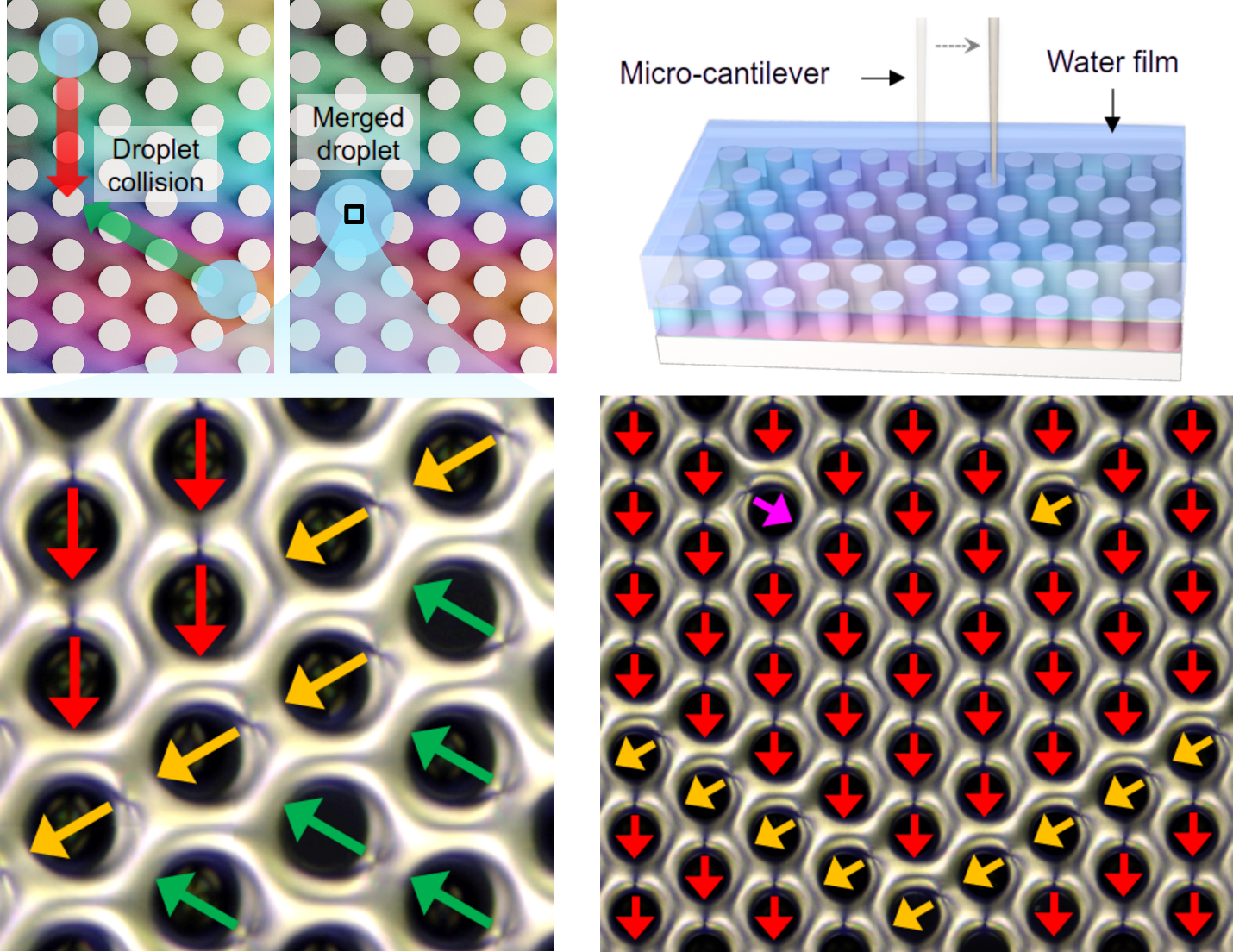 Each defect can pick one of the 6 positions around its post, so we can say each post has a direction, like a weather vane. If the droplet is deposited when the liquid crystal is disordered, then upon cooling we get randomized directions. This orientational order exists not on the level of a single molecule, but as two-dimensional pattern of directions on the posts, clearly visible under the microscope. The comparison with the weather vane goes further, as the defects react to the flow of the water on top. The defects move to the trailing direction of the flow, so that we can read out the direction directly from the patterns in liquid crystals. This pattern stays intact after the flow stops, so it records a memory of past motion, such as movement of droplets, their collisions, or just squirting water around with a syringe. Using a tiny cantilever tool, individual weather vanes can be turned at will, like painting a picture out of individual pixels (see Figure 2). The pattern can be reset to a random state by heating above the nematic-isotropic transition, and colling it back down.