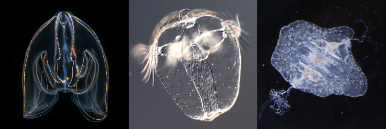 Ctenopore species housed in the Evolutionary Neurobiology Unit, OIST (Japan) — Bolinopsis mikado (adult-left, larva-middle) and Vallicula multiformis (right).