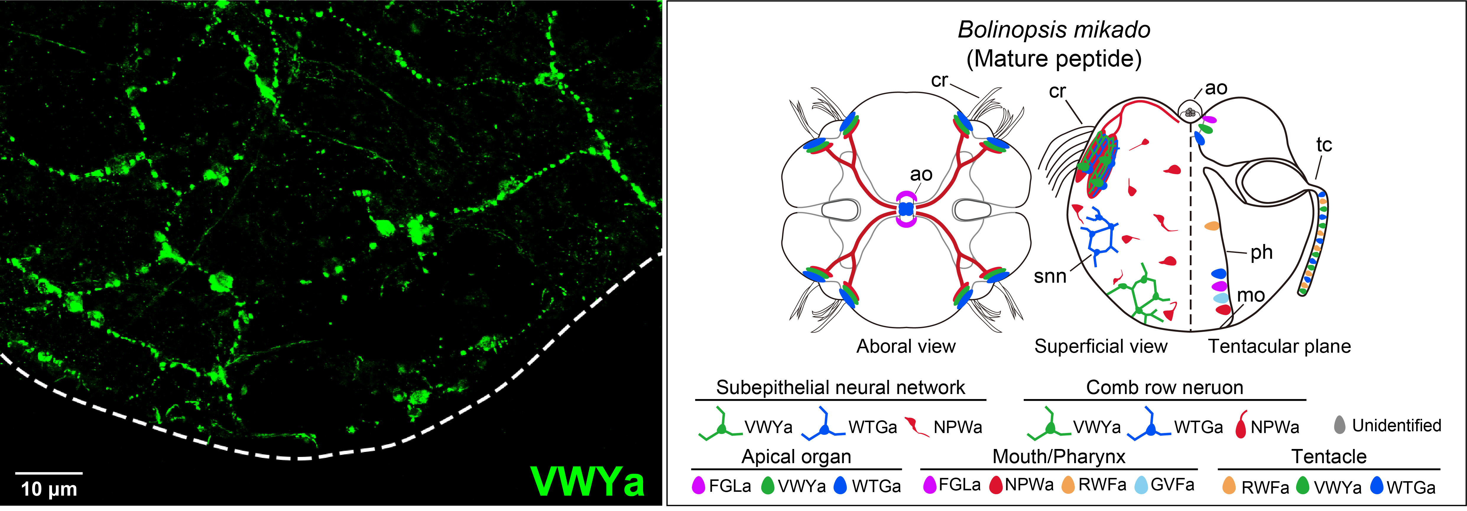 Nerve net of the ctenophore Bolinopsis mikado labelled with anti-VWYamide antibody (left). Schematic diagram of the spatial distribution of peptide-expressing neurons/cells in Bolinopsis larva (right).
