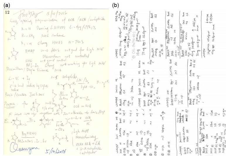 Figure 1. Written notes about (a) synthetic strategy of photoredox ring-opening polymerization, and (b) experiments of optimizing the reaction conditions.