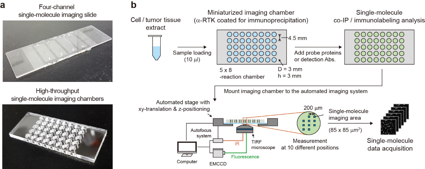 Several research groups, including ours, are developing a collection of techniques called single-molecule pull-down and co-immunoprecipitation (co-IP), which allows for the study of cellular protein complexes without prior purification steps1-4. We noted that this new single-molecule toolbox would be an ideal platform for studying PPI networks for individual cancer patients. Unfortunately, the throughput of single-molecule co-IP was still too low to examine the huge and complex PPI networks. The reaction chamber, typically used in the single-molecule imaging field, permits only four or five reactions per assembled microscope slide (Fig. 1a, top)1,2. To increase the number of reactions accommodated in a single microscope slide, I designed a small-well system with the help of Sangwoo Park and Hyunwoo Kim, who are co-authors of our new paper. We also tested many materials for the well walls that include house-made polydimethylsiloxane and silicon gaskets. We finally came up with a single-molecule imaging chip with 40 reaction chambers and minimal crosstalks and non-specific protein adsorptions (Fig. 1a, bottom).