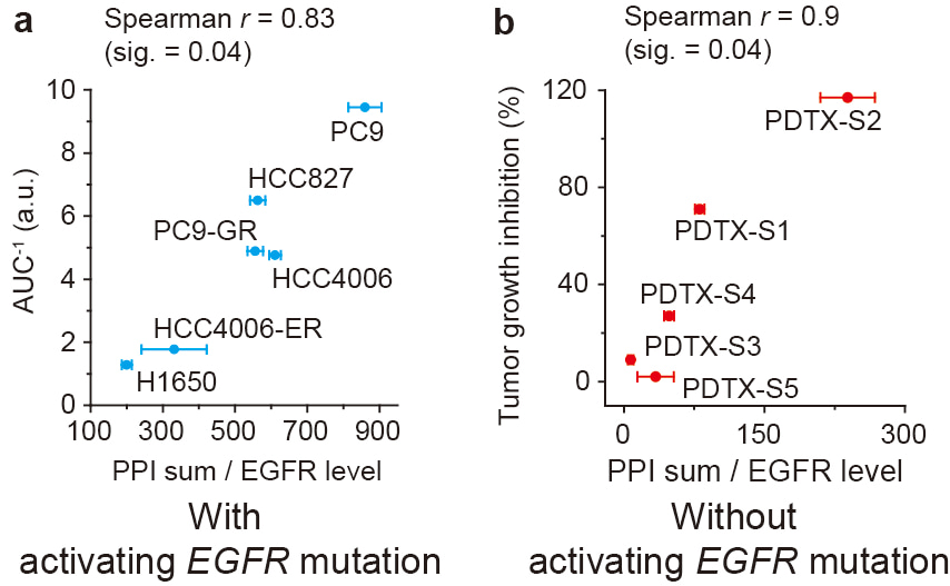 Fig. 2 Correlation of EGFR PPI to the response of EGFR-targeted therapy. Correlation of EGFR-PPI level with the responses to an EGFR-targeted therapy from lung adenocarcinoma cell lines having activating EGFR mutations (a) and patient-derived tumor xenografts without any EGFR mutations (b). Figure is reproduced from Fig. 4 and 5 of our paper. Macmillan Publishers.