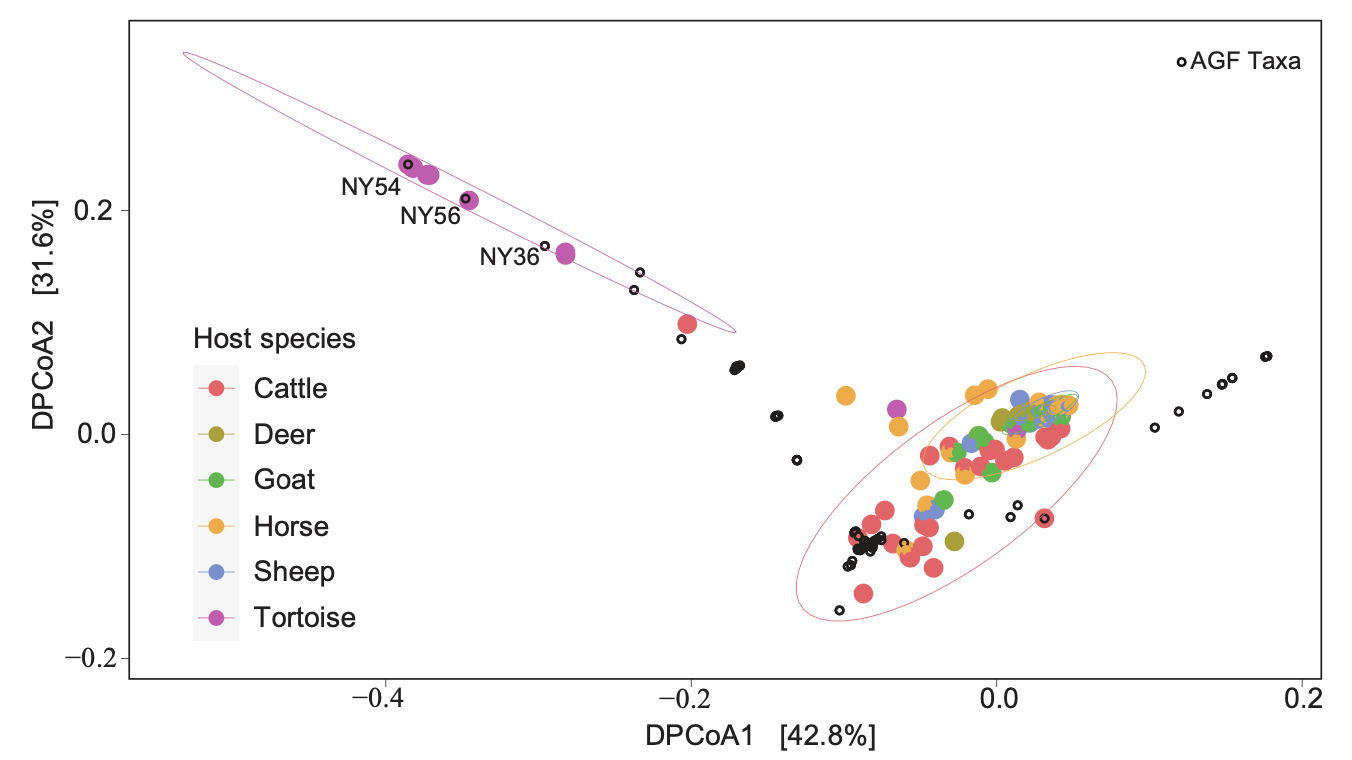 This investigation of AGF communities in tortoises revealed that three genera represented the majority of AGF in most of our samples, contrasting their low abundance in sampled mammals. Evolutionary timing estimates for these tortoise-associated AGF genera predate all other known AGF genera and the divergence of current mammalian hosts. Finally, the limited capacity for carbohydrate metabolism displayed by tortoise-associated AGF suggests they contribute minimally to substrate depolymerization and leaves the ecological role of tortoise-associated AGF unclear. Regardless of this uncertainty, what is clear is that the presence of AGF in non-mammalian hosts requires us to rethink what we know about the evolution of the anaerobic fungi, AGF-host symbiosis, and their ecological roles.