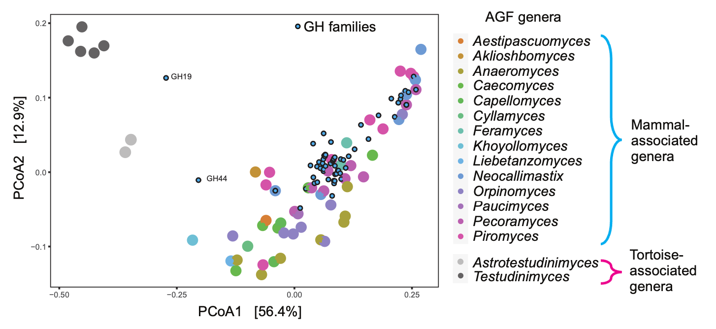 Many of the carbohydrate-active enzyme families missing or reduced in tortoise-associated AGF have been previously shown as acquired by AGF via horizontal gene transfer. We found that there were far fewer events of horizontal gene transfer in tortoise- vs mammal-associated AGF (35 vs 277). Most of the events in tortoise-associated AGF were previously identified in mammal-associated AGF and related to metabolic functions like enabling anaerobiosis and acquiring carbohydrate-active enzymes. This finding indicates an ancient acquisition of these genes preceding the tortoise- and mammal-associated AGF split, after which only mammal-associated AGF underwent a wave of gene acquisition and gained their powerful plant biomass degrading machinery.