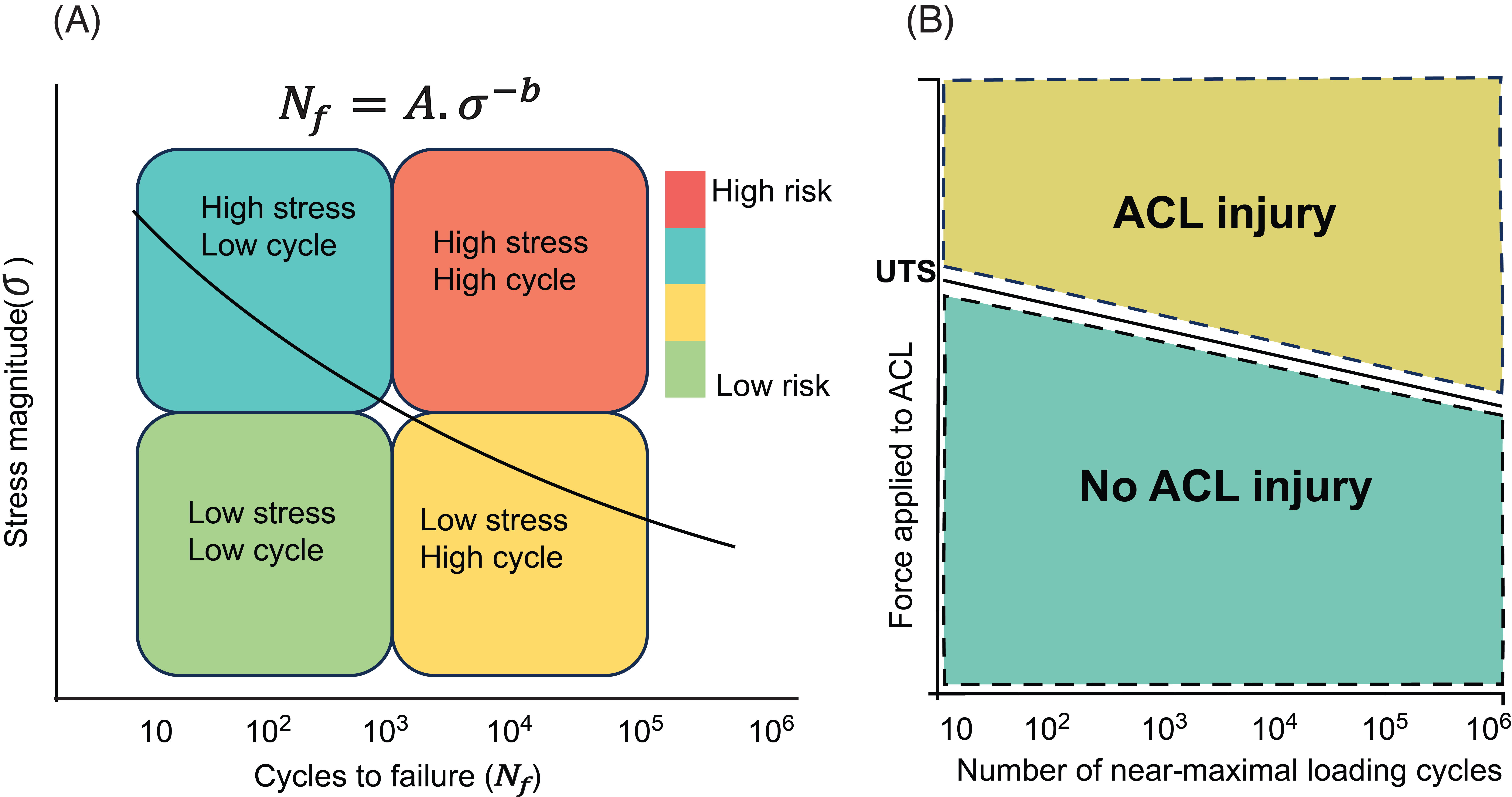 Figure. 1. Development of fatigue injury is considered an important part of the anterior cruciate ligament injury mechanism. (A) Theoretical stress-life plot and patterns of fatigue failure risk for different combinations of loading magnitude and loading cycles. where A is a proportionality constant, and b is the slope of the S-N curve. Fatigue life is defined as the number of cycles to failure Nf at a particular stress magnitude σ. (B) illustrating the inverse relationship between force applied to the anterior cruciate ligament (ACL) and the number of near-maximal loading cycles it can withstand before failing. [adapted from (DOI: 10.1080/00140139.2016.1208848), (A), and (10) (B)]. Copyright© Taylor & Francis Group. Revised and used with permission.