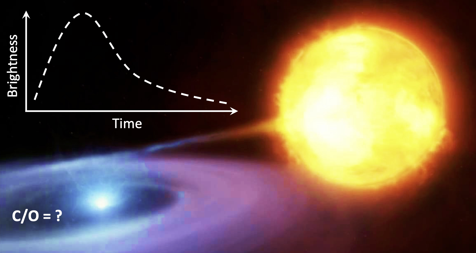 Accretion of matter onto a carbon-oxygen White Dwarf from a companion star along with an indicative plot of a Type Ia supernova light-curve as a function of time.