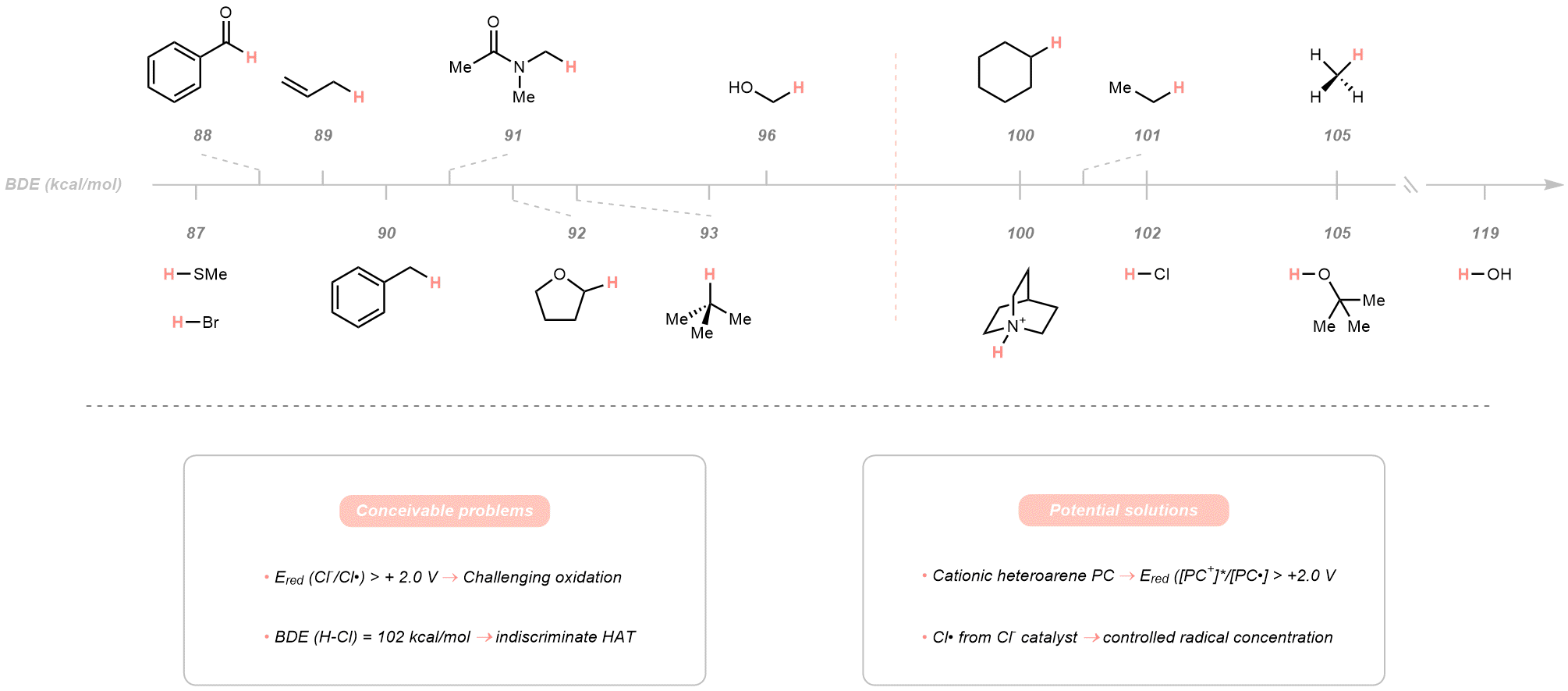 Scheme 2 BDEs of common C-H bonds (upper) and existing challenges and potential solutions for Cl·- mediated HAT. BDE, bond dissociation energy; PC, photocatalyst; Red, reduction.