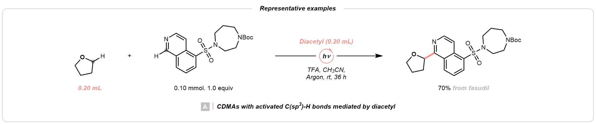 Aligned with many other research endeavors, we contributed a photoinduced CDMA that was driven by a lost-cost, readily available but uniquely enabling vicinal diketone reagent, 2,3-butanedione (also named diacetyl or biacetyl), which acted not only as a photosensitizer but also stoichiometric oxidant during the reaction (Scheme 1, Chem. Sci. 2019, 10, 5018-5024). We were pleased to see that this protocol was successfully upgraded to an asymmetric version by Phipps’s group in their recent work (J. Am. Chem. Soc. 2021, 143, 4928-4934). Despite these advancements, the diacetyl system was only amenable with some activated aliphatic substrates due in part to the prohibitively high bond dissociation energies (BDEs) of non-activated C-H bonds. It demanded the presence of peroxides for an extended scope with strong C-H bond-containing substrates (Scheme 2). Besides, the requirement of largely excessive diacetyl as a light-absorptive oxidizing agent remained as its drawback.
