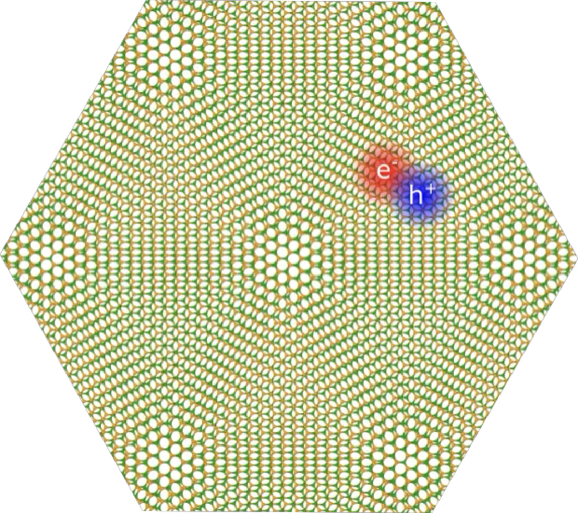 To create efficient solar cells and light-emitting diodes, we need to understand and control excitons in materials. For example, solar cells convert sunlight into electricity by generating electron-hole pairs and then separating them to produce electricity. The efficiency of a solar cell depends critically on how tightly these electron-hole pairs are bound, how far they can travel, and how long they live before losing their energy. But there's a challenge: predicting how excitons behave is limited to simple systems, even with modern supercomputers. These computations take weeks to months to complete, making it hard to truly design materials with target applications. To overcome this challenge, we developed a new computational approach based on first-principles (i.e., no knowledge of lab experiments). Using this strategy, we successfully captured the behavior of excitons in moiré materials (see image).