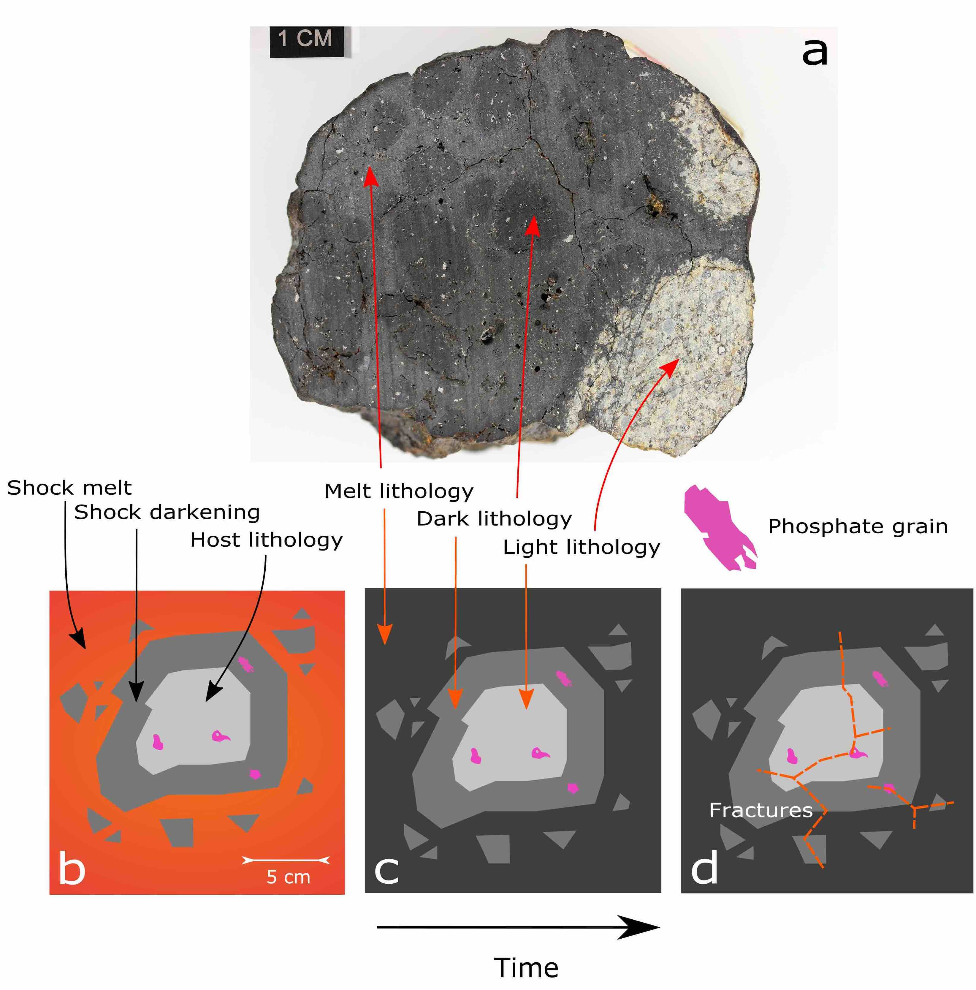 Figure 2: Rock textures in Chelyabinsk. Panels a-d: evolution of Chelyabinsk breccia (a), from (b) initial formation during shock-melting, brecciation, and shock darkening of host rock material, through (c) solidification into light, dark, and melt lithologies, and (d) subsequent minor disturbances, such as the propagation of fracture networks. Pink symbols represent host-rock phosphate minerals, which are only found in the light and dark lithologies. Photograph used is of Chelyabinsk specimen NHMV-O707; Credit Ludovic Ferriere-NHM Vienna, Austria.