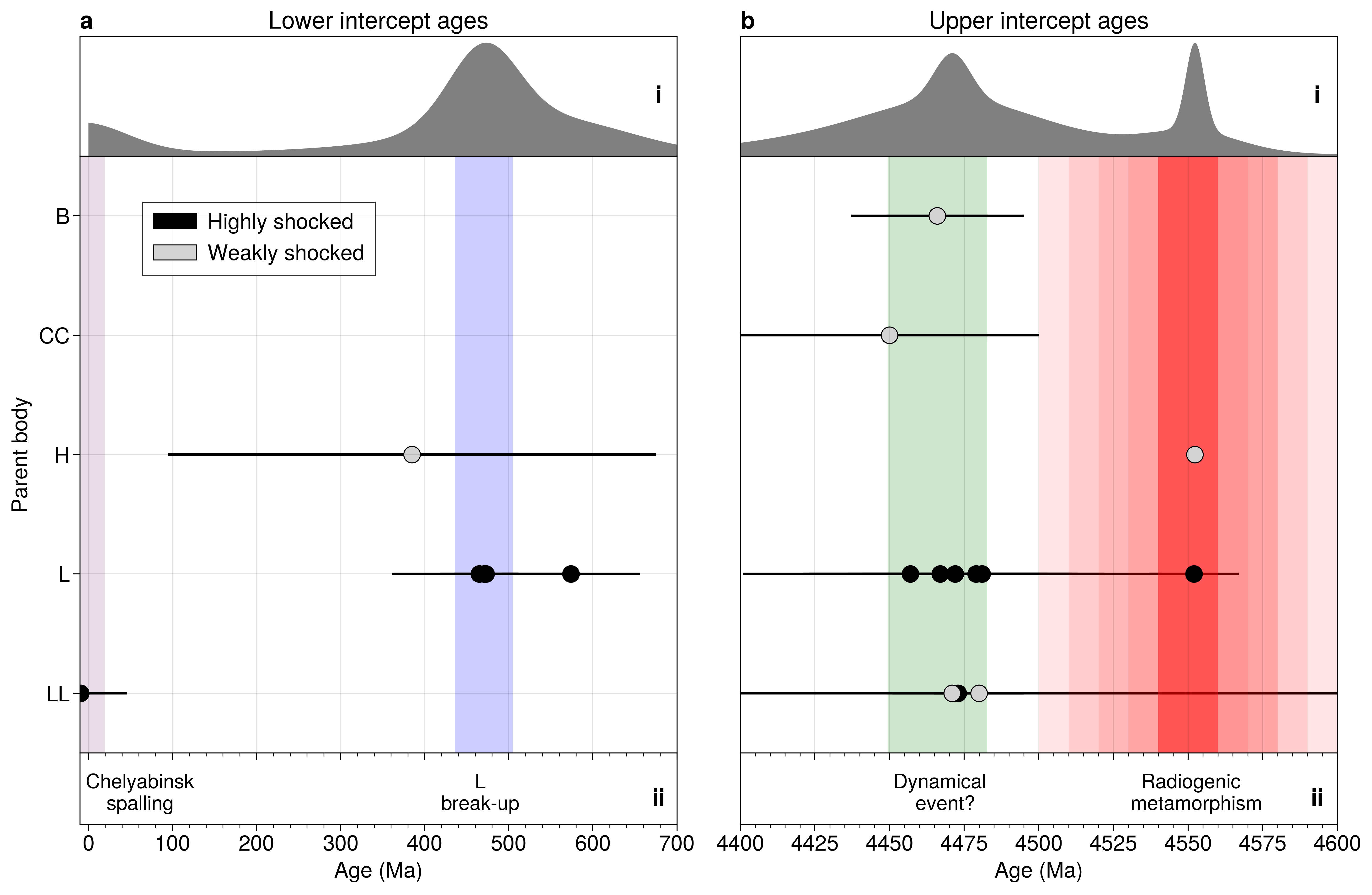 From our new data, we can have more confidence that upper intercept ages younger than the end of parent body heating on asteroids reliably record intense collisional reheating, as they do in Chelyabinsk. The clustering of ages at 4450-4480 Ma, in meteorites from various different parent bodies, is indicative of a major dynamical event that generated numerous energetic collisions in this time frame – this may be either late instability or Moon-formation. Meanwhile, we must be cautious of lower intercept ages that were obtained from data that lie far from the lower intercept, and/or did not take into account grain micro-textures when placing spots for analysis. However, the lower intercept record may still be geologically meaningful, especially if texturally guided analyses become the norm.