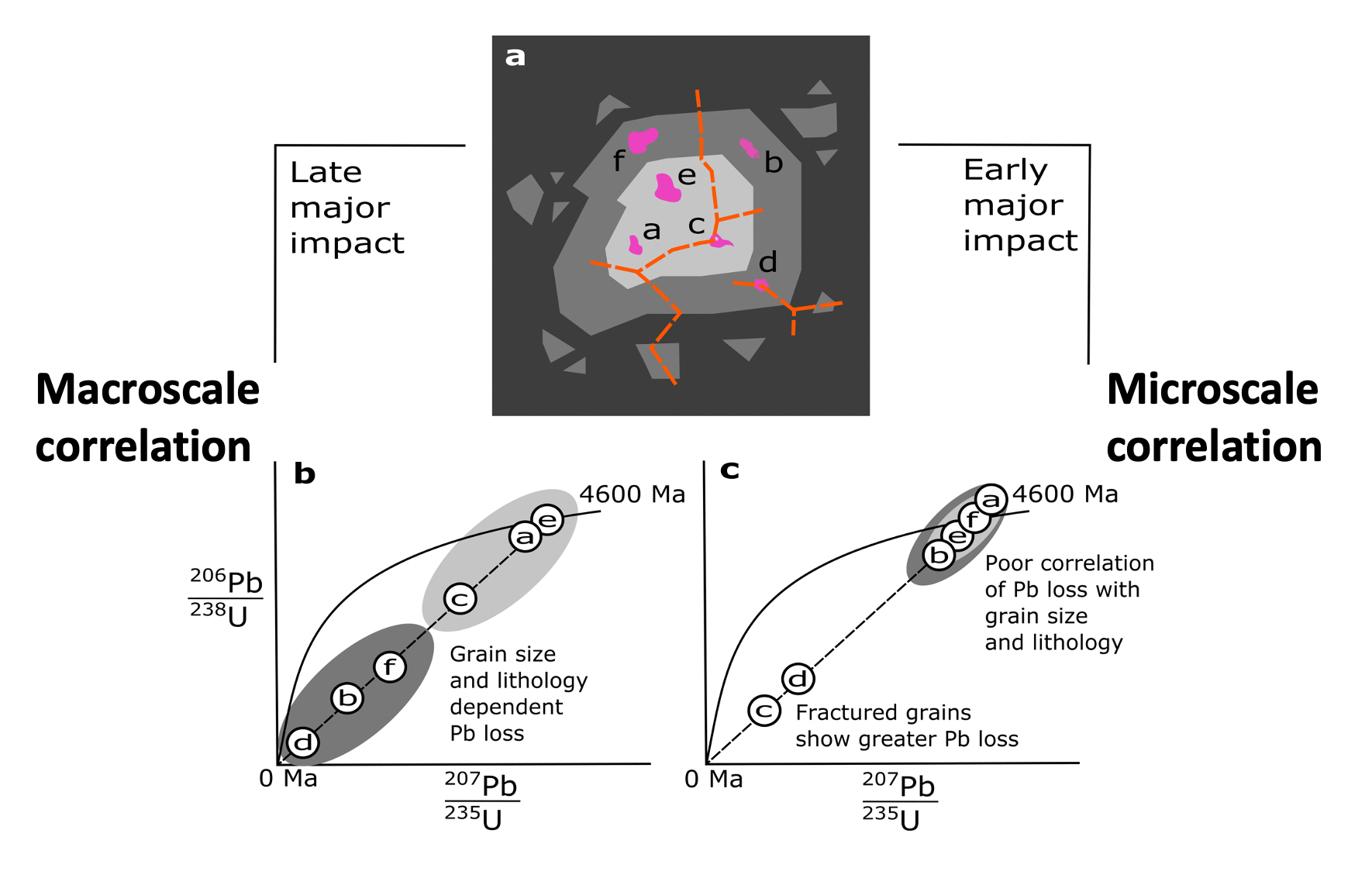 - Option 2) If recent Lead-loss occurred during a more minor recent event, and the three lithologies formed a long time ago, then there should be no such correlation of Lead-loss with lithology. We may instead expect Lead-loss to correlate within each lithology with overprinting textural features, such as fractures, which could have damaged the phosphate crystal lattice.