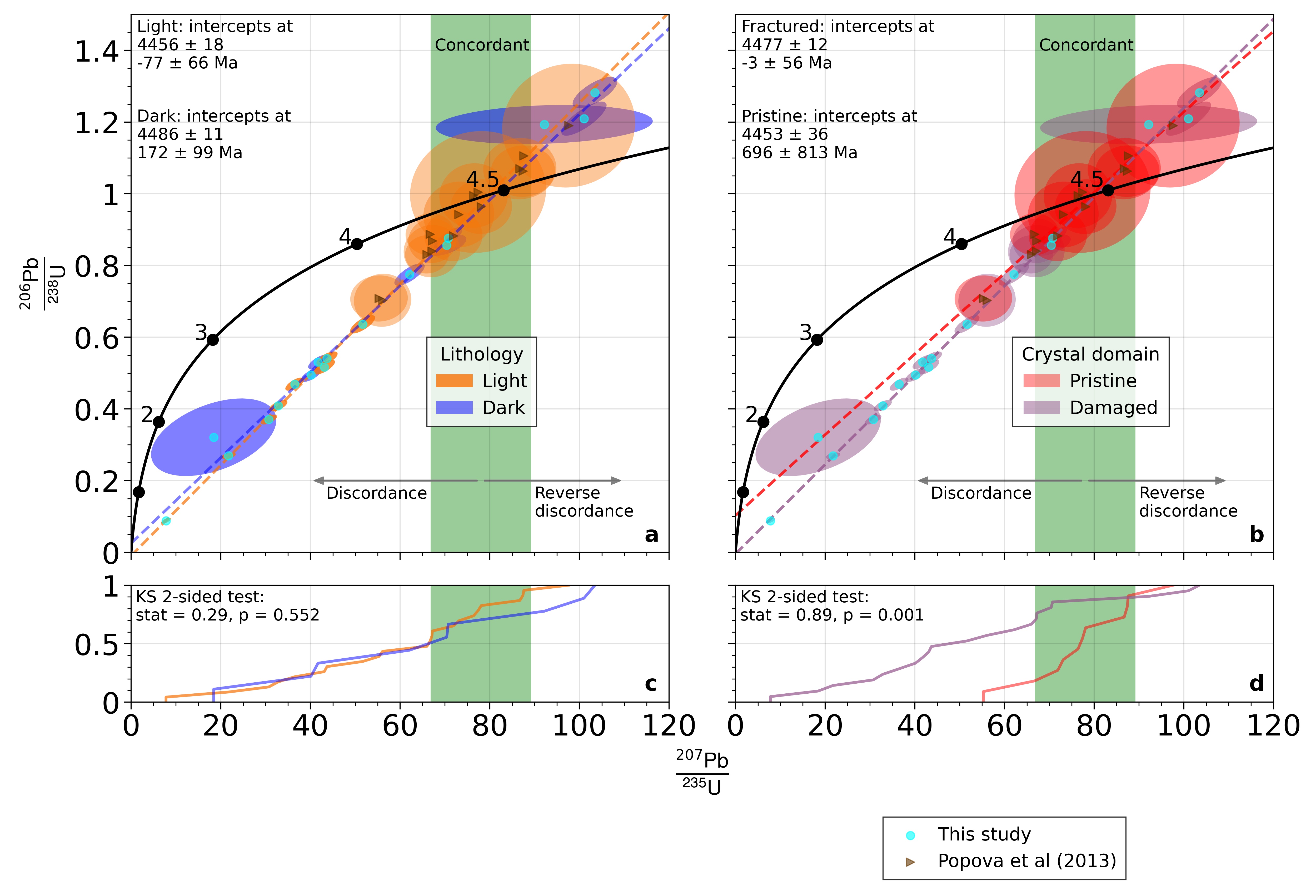 We tested each scenario with Secondary Ionisation mass spectrometry analyses, giving us spot compositions that we can tie to individual grain textures. Figure 4 shows the key results. Once again you are looking at spot data plotted on a concordia diagram, with light blue markers indicating the center of ellipsoidal errors. I have also plotted previously measured data from one of those earlier studies on Chelyabinsk phosphate Uranium-Lead ages, with brown triangle markers. On the left hand plot, the data are colour coded by lithology: purple for dark lithology, orange for light lithology. On the right hand plot, the data are colour coded by crystal domain, light purple are damaged domains (spots overlapping fractures) and red is pristine domains (no visible defects in proximity). Below each plot are graphs of the cumulative distribution of 207Pb/235U compositions, allowing us to visualize how similar these data groupings are. Shaded in green is a reasonable range of graph space that corresponds - given the analytical errors we tend to get - to concordant data.