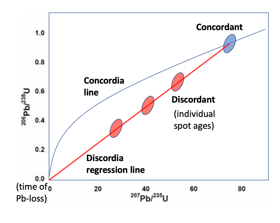 Figure 1: General form of a concordia diagram for calculating Uranium-Lead ages. The age of formation of a hypothetical U-bearing phase is obtained with a concordant data point (in blue), along with the timing of a recent thermal disturbance being recorded by discordant data points (in red) from several grains (e.g., of different sizes).