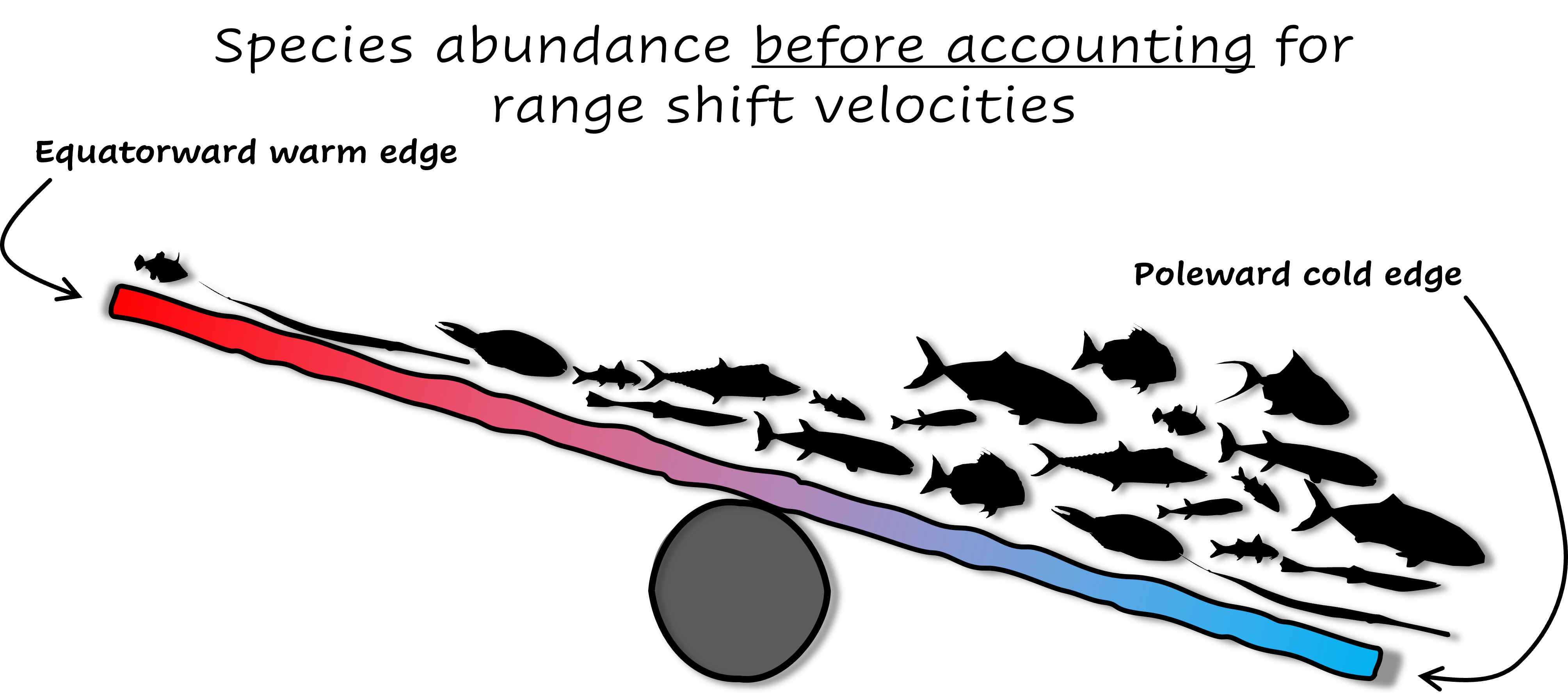 Understanding how local changes in species’ population size are affected by shifts in geographic range presents a multifaceted challenge. For species predicted to benefit from climate change (‘winners’), basic models assume their overall abundance remains stable after a range shift. This implies a seesaw where populations in the equatorward side of the species range decline as their range contracts, while populations in the poleward side of the species range grow due to expansion. A recent study in marine species corroborates this, demonstrating abundance increases in cooler, poleward populations alongside declines in warmer, equatorward ones. However, range shift velocities vary considerably, with some species sprinting poleward at up to 100 kilometers per year while others barely budge. We thereby ask: