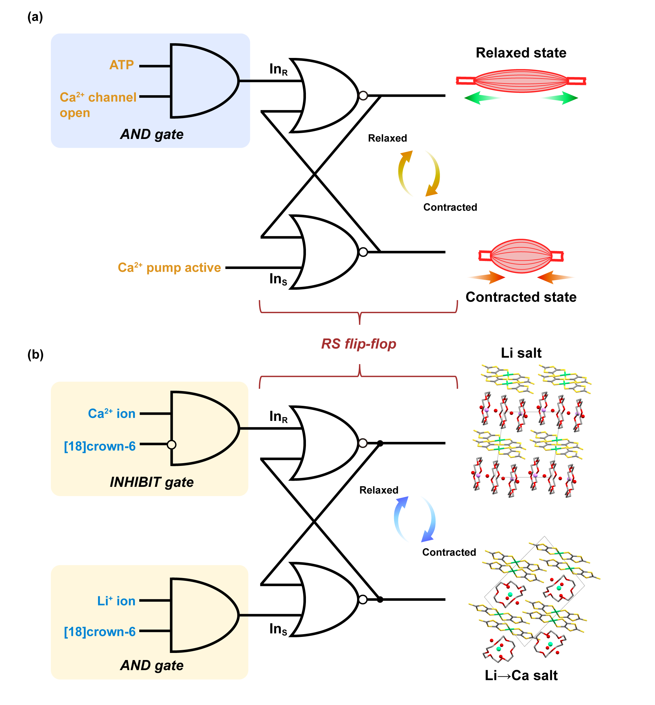 Our Li salt can switch between the contracting and relaxing states depending on the environment of the aqueous solution (Figure 2b). In the presence of Ca2+ ions, the Ca2+ ion exchange reaction proceeds with the desorption of [18]crown-6 from the crystal, resulting in volume contraction. In environments containing excess [18]crown-6, the ion-exchange reaction is inhibited; this reaction is described as an INHIBIT gate. Furthermore, this ion-exchange reaction is reversible and returns the original structure of Li salt (relaxed state) in the presence of [18]crown-6 and Li+. Of course, this reaction cannot proceed with either [18]crown-6 or Li+ alone; therefore, it acts as an AND gate. These reactions also depend on whether the crystals immersed in the aqueous solution are in a contracted or relaxed state. Therefore, the sequence of reactions is integrated as an RS flip-flop circuit, with the outputs of the INHIBIT and AND gates fed into the inputs. These reversible changes are analogous to the repeated contraction and relaxation behaviours of muscles, and their logic gates are similar. In addition, the crystal-derived magnetism and conductivity also change significantly with structural changes; therefore, the above reactions serve as logic gates that can control the macroscopic structure and physical properties. This logic gate can also control the transformation of physical properties corresponding to reversible structural changes, such as those in muscles, and is expected to have more applications in more advanced material development beyond living organisms.