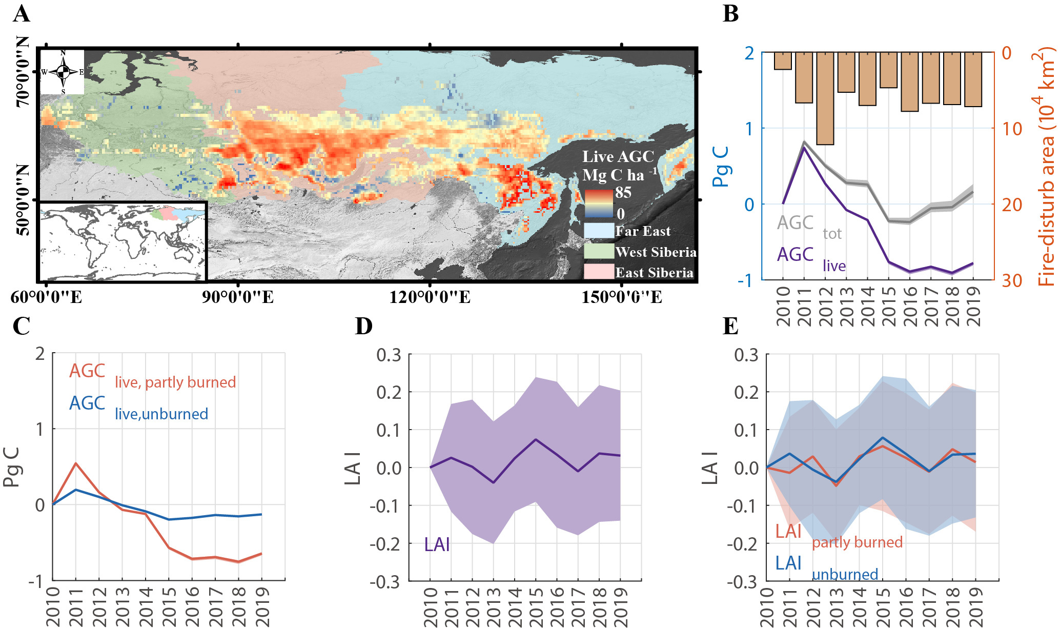 Fig. 3. Temporal variations in annual aboveground carbon and leaf area index (LAI) over Siberian forests. A, the spatial distribution of live aboveground carbon (AGClive) in 2010. B, Annual values of total aboveground carbon (AGClive) and stocks, relative to those in 2010, respectively. C, E, Corresponding changes in /LAI are shown for partly burned and unburned regions. D, Annual values of LAI relative to LAI in 2010.