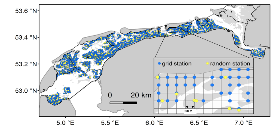 The sampling design involves systematically collecting samples every 500 meters across the exposed mudflats, with an additional 20% of locations/sampling stations chosen at random on grid lines to allow estimating spatial patterns. This approach allows researchers to track ecosystem changes with confidence, helping to distinguish between natural fluctuations and human impacts such as gas extraction, salt mining, dredging activities, or other human interventions.