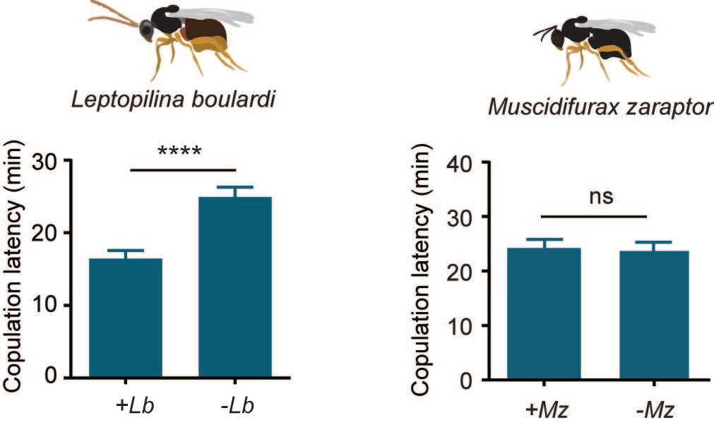In the beginning, we expected that the presence of parasitoid wasps stops or delays mating. Surprisingly, flies mate quicker in the presence of parasitoid wasps (Fig. 1). The acceleration of mating upon seeing parasitoid wasps is conserved in multiple Drosophila species, which occupy diverse habitats and have different relations to each other. This effect is also induced by several wasps that parasitize Drosophila (e.g., Leptopilina boulardi, Lb) (Fig. 2a). Parasitoid wasps that do not parasitize Drosophila, such as Muscidifurax zaraptor (Mz), do not change Drosophila mating (Fig. 2b).