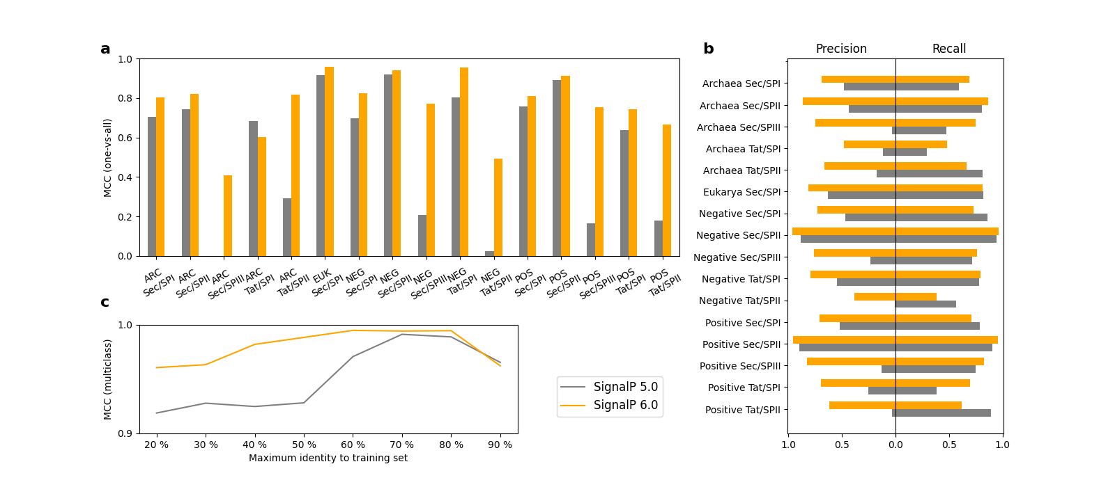 Indeed, our results show that SignalP 6.0 is able to learn the rare SP types. As can be seen in panel a of the figure below, SignalP 6.0 is better at recognizing almost all categories than a version of the SignalP 5.0 architecture retrained on our new dataset. The improvement is especially drastic for the rare types, Tat/SPII and Sec/SPIII, where the SignalP 5.0 performance is generally too low to be practically useful. Furthermore, the advantage of SignalP 6.0 over the SignalP 5.0 architecture is higher for sequences that are distantly related to those in the training set (panel c in the figure below), underlining the excellent generalization ability of the protein LM.