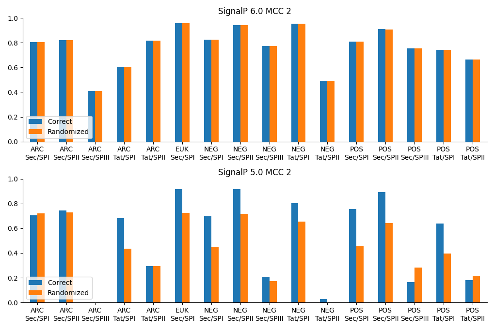 We also found that SignalP 6.0 does not “care” about the taxonomic origin of the sequences. The model was informed during training whether each sequence originated from Eukarya, Gram-positive bacteria, Gram-negative bacteria, or Archaea. We carried out an experiment shuffling the organism group labels and testing the models again, and while that operation substantially deteriorated the SignalP 5.0 performance, it did not affect SignalP 6.0 performance (see figure below). This carries two advantages: First, SignalP 6.0 can be used for sequences where the origin is unknown, such as metagenomic datasets; second, it is directly applicable to bacteria that are ambiguous with respect to the Gram-positive/Gram-negative divide, such as Thermotogae, Tenericutes, or Negativicutes. The final SignalP 6.0 server just has an option for selecting “Eukarya” or “Other”, where the only difference is that the “Eukarya” option suppresses predictions of other types than Sec/SPI (the only type of SP in the ER membrane).