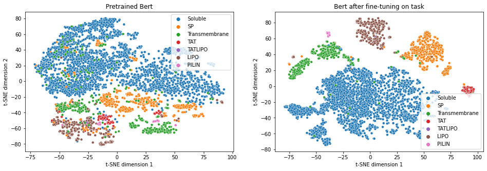 We used a pretrained protein LM taken from the project ProtTrans [9]. In order to perform better in our downstream task of SP prediction, we fine-tuned the model. Fine-tuning improved the separation of the various categories of SPs and non-SPs, but as can be seen from the figure below, the ProtTrans model “knew” something about SPs already before fine-tuning.