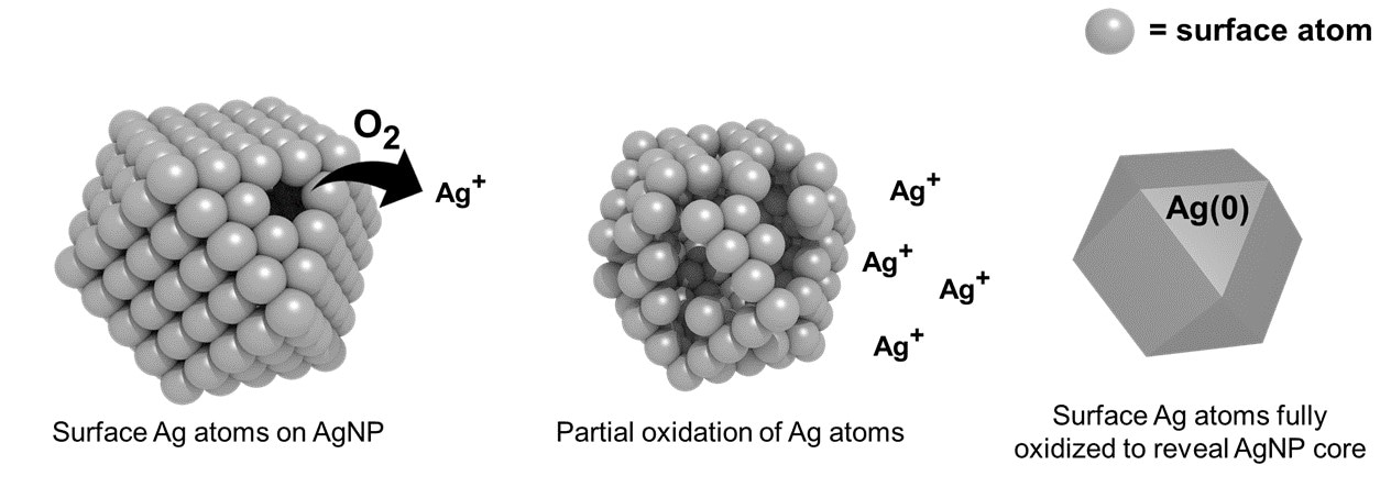 Silver atoms on the nanoparticle surface interact with oxygen to release silver ions as another mode of toxicity.