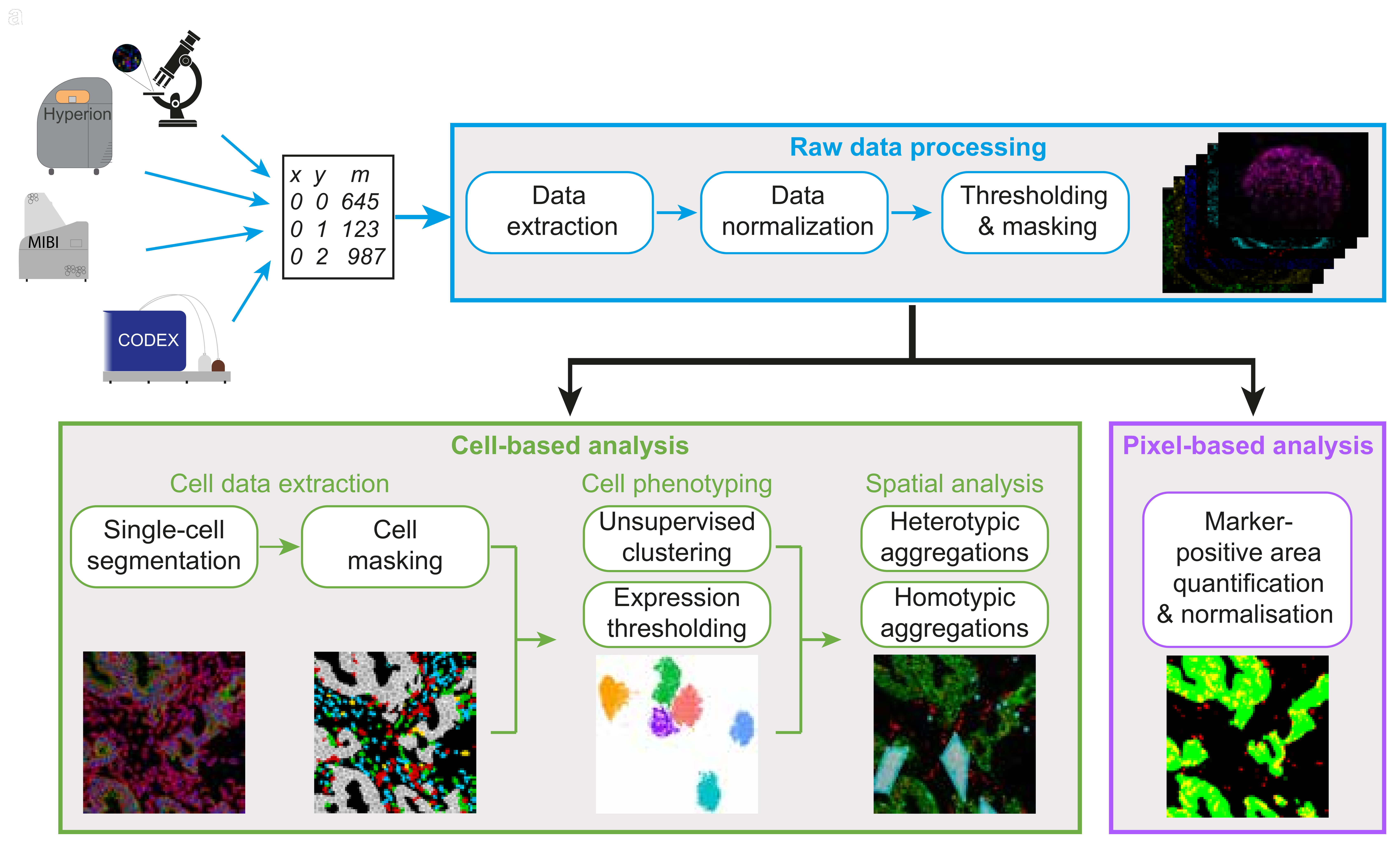 To address these issues we developed SIMPLI (Single-cell Identification from MultiPlexed Images), a highly customizable technology-agnostic pipeline covering all steps of multiplexed imaging data analysis. SIMPLI performs raw image processing, cell segmentation, cell phenotyping and spatial analysis as well as a cell-independent quantifications of areas positive for user specified combinations of markers at the pixel level. All steps of the analysis are optional and highly customizable and at each step SIMPLI produces multiple tabular and graphical outputs.