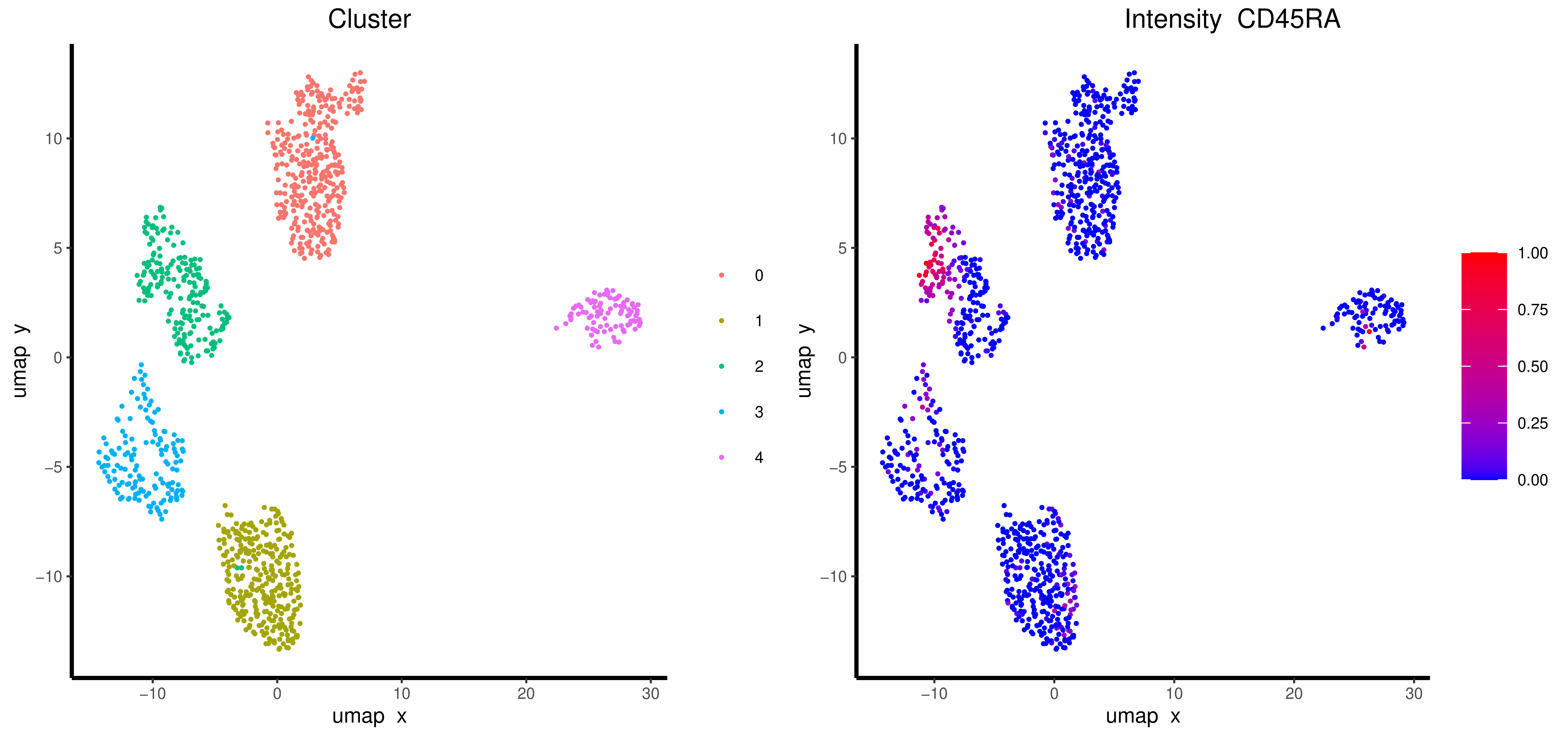 SIMPLI can then perform a more in depth phenotyping of cells using both unsupervised clustering and expression thresholding. In our example we showcase the unsupervised clustering of T cells, here represented as a UMAP projection coulured by cluster and according to CD45RA expression.