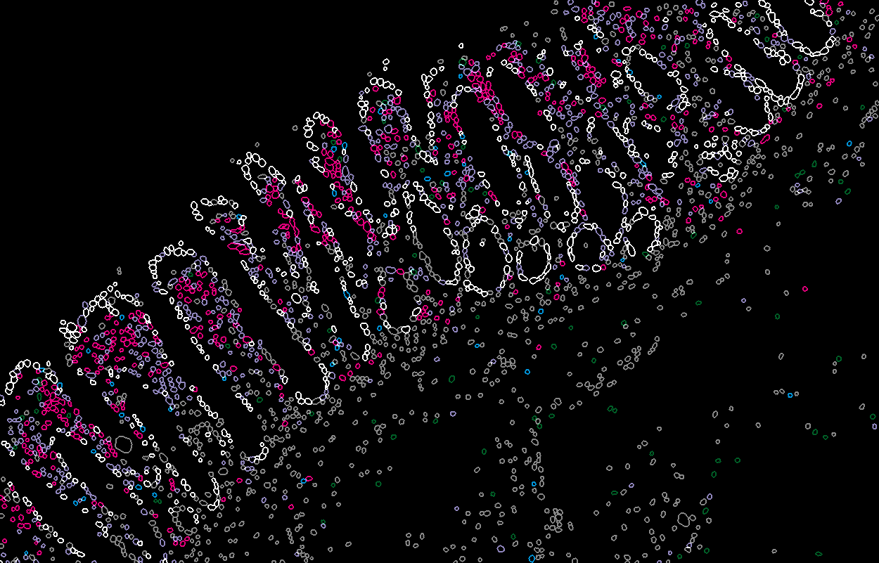 In our example we showcase first the identification of high density clusters of proliferating epithelial cells which as expected are located at the bottom of the epithelial crypts.