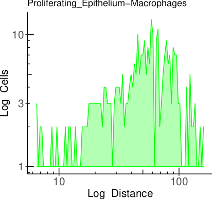 We then calculated the distribution of minimum distances between the proliferating epithelial cells and macrophages, showing that most of these cells are located within a 50μm distance of each other.