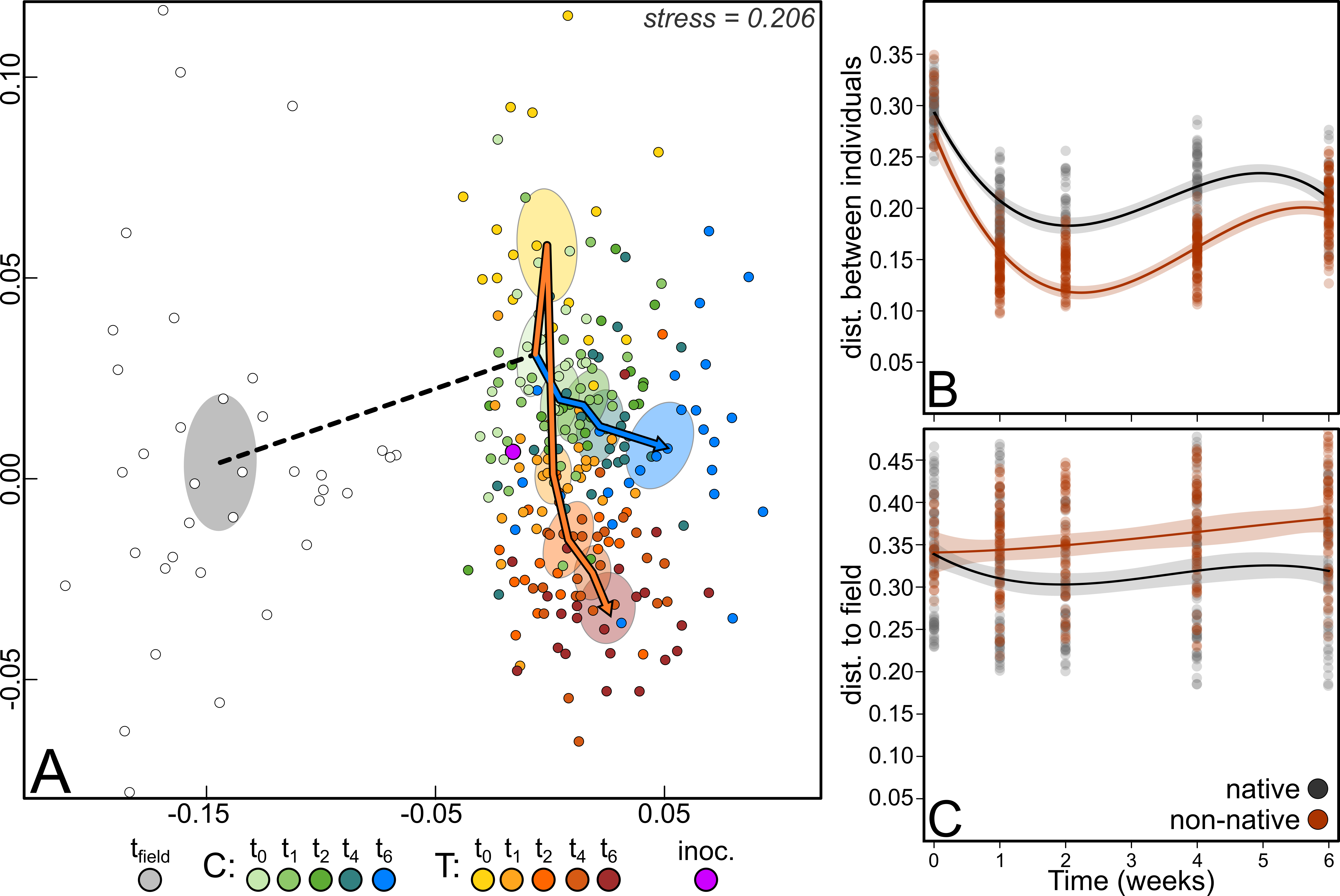 - Invaders are more flexible. Interestingly, microbial communities of non-native populations (Europe and North America) became more similar to one another than those from the native populations (Asia, Figure 2B). In turn, microbial communities associated with those from the native range remained more similar to the composition observed in the field (Figure 2C). In other words, the native seaweeds seemed pickier toward microbial symbionts and less flexible than the non-natives.