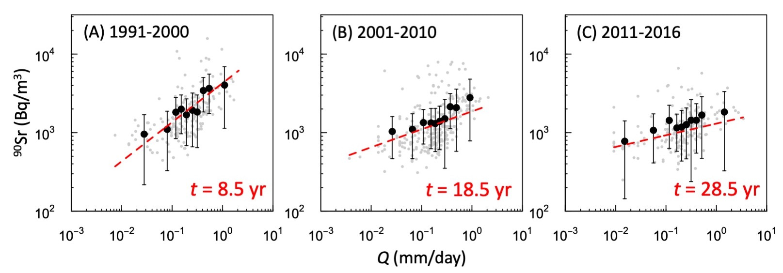 Using the long-record results in CEZ, this study is the first to show the time-dependency of the 90Sr-Q relationship from long-term field observations in the Sakhan catchment, even after the attenuation correction. This result means that the time-dependency of the 90Sr-Q relationship is not caused by the long-term attenuation of the 90Sr concentration, but by the changing concentration formation processes over a long period of time. This is because the water flow pathways in the soil do not change over timescales of a few decades. The solute concentration in the soil, which is the source of 90Sr in the stream water, is thought to have changed over time just after the accident. In fact, the vertical profile of the 90Sr concentration in the soil changes with time.