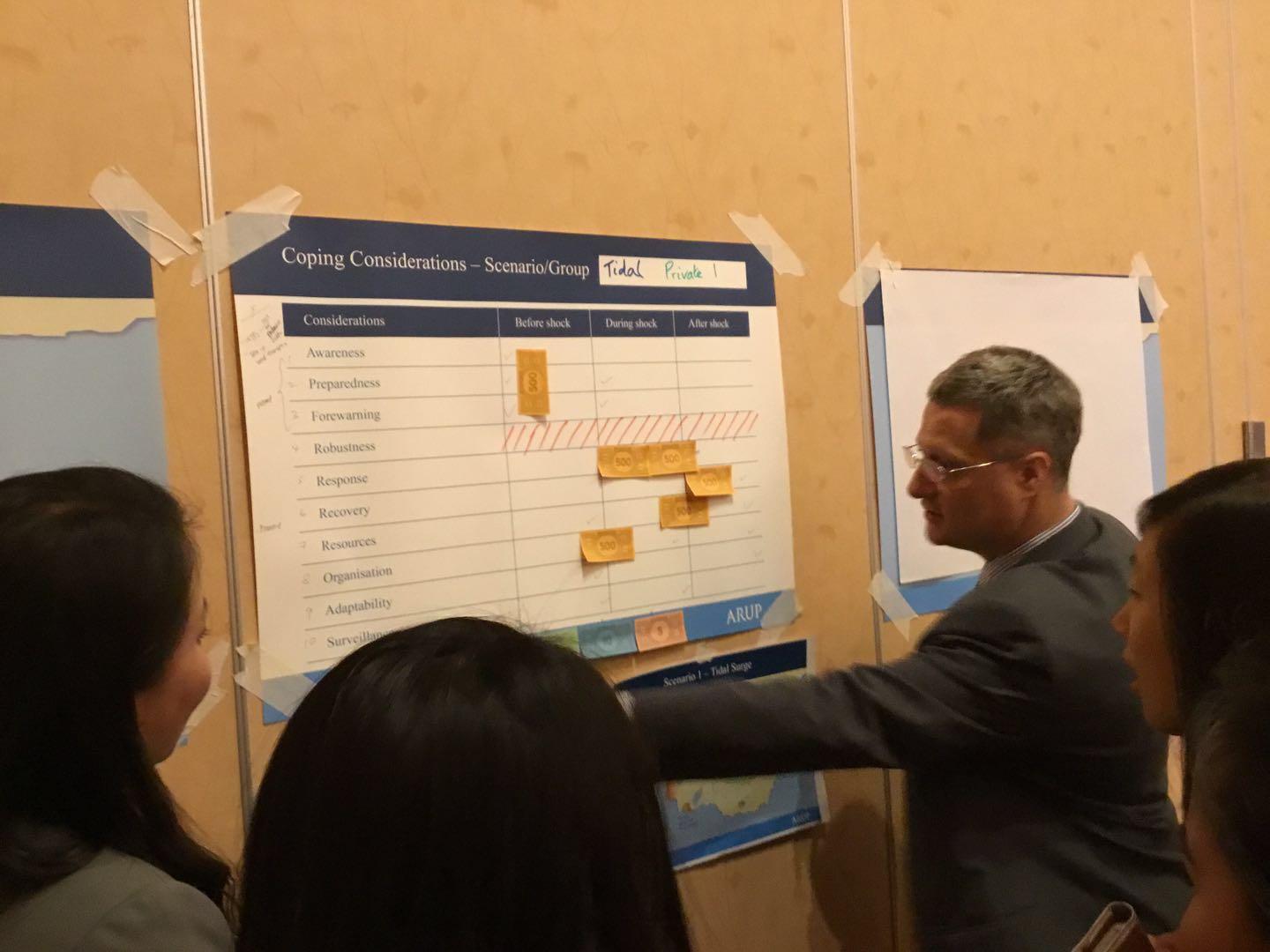 It's exciting to see that there is a growing emphasis on climatic extremes adaptation. Mike Dobson from ARUP, a world leading environment consultant company, has shown us their proposed disaster planning matrix to guide government better cope with any climatic extreme. The matrix encompasses awareness, preparedness, forewarning, robustness, response, recovery, resources, organizations, adaptability and surveillance, where government should devote different amounts of money before, during and after extremes according the distinctive local contextual factors. As you can see from the photo, we were pretending a national leader to allocate financial resources in each category for our little island!