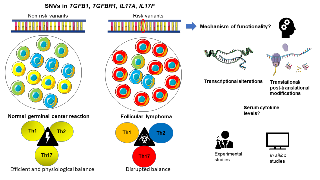 Immune responses in germinal centers encompass adequate levels of Th1, Th2 and Th17 cytokines, which act on B-cell maturation (left panel). We have observed that single nucleotide variants (SNVs) in 4 cytokine genes (TGFB1, TGFBR1, IL17A and IL17F) are responsible for an increased susceptibility for follicular lymphoma (middle panel). These SNVs were previously implicated in the modulation of immune responses in contexts other than lymphomas. We hypothesize that these SNVs may also alter the immune balance to favor lymphomagenesis. However, this was not a specific question of this study. Further investigations, either in silico or experimental, may elucidate the specific step (transcription, translation, post-translational modifications) by which the SNVs act on the respective pathways (right panel).
