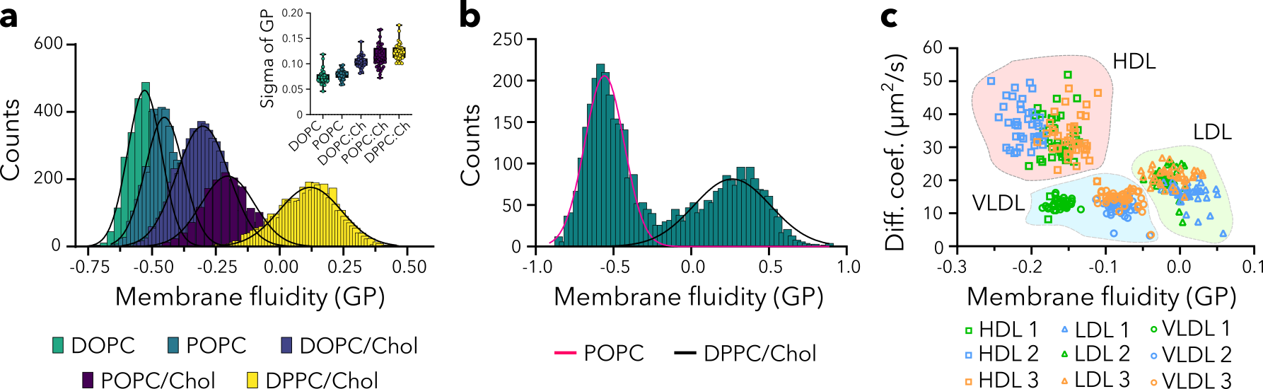 Figure3: a) GP histograms for liposomes of different compositions; Width of GP distributions (inlet); b) histogram of mixture of POPC and DPPC/Chol liposomes with clear two populations; c) Diffusion vs. GP diagram for lipoproteins from healthy individuals,